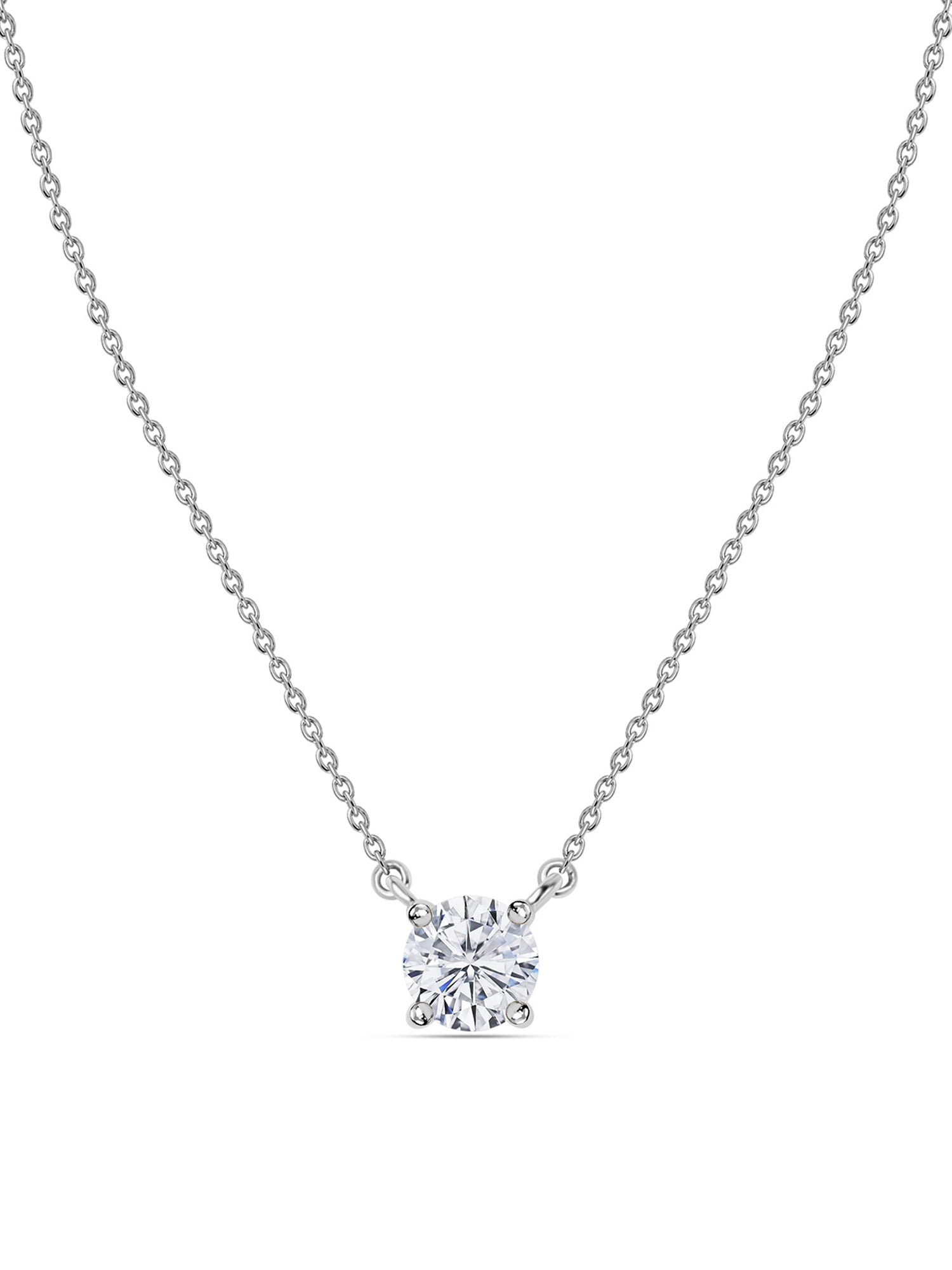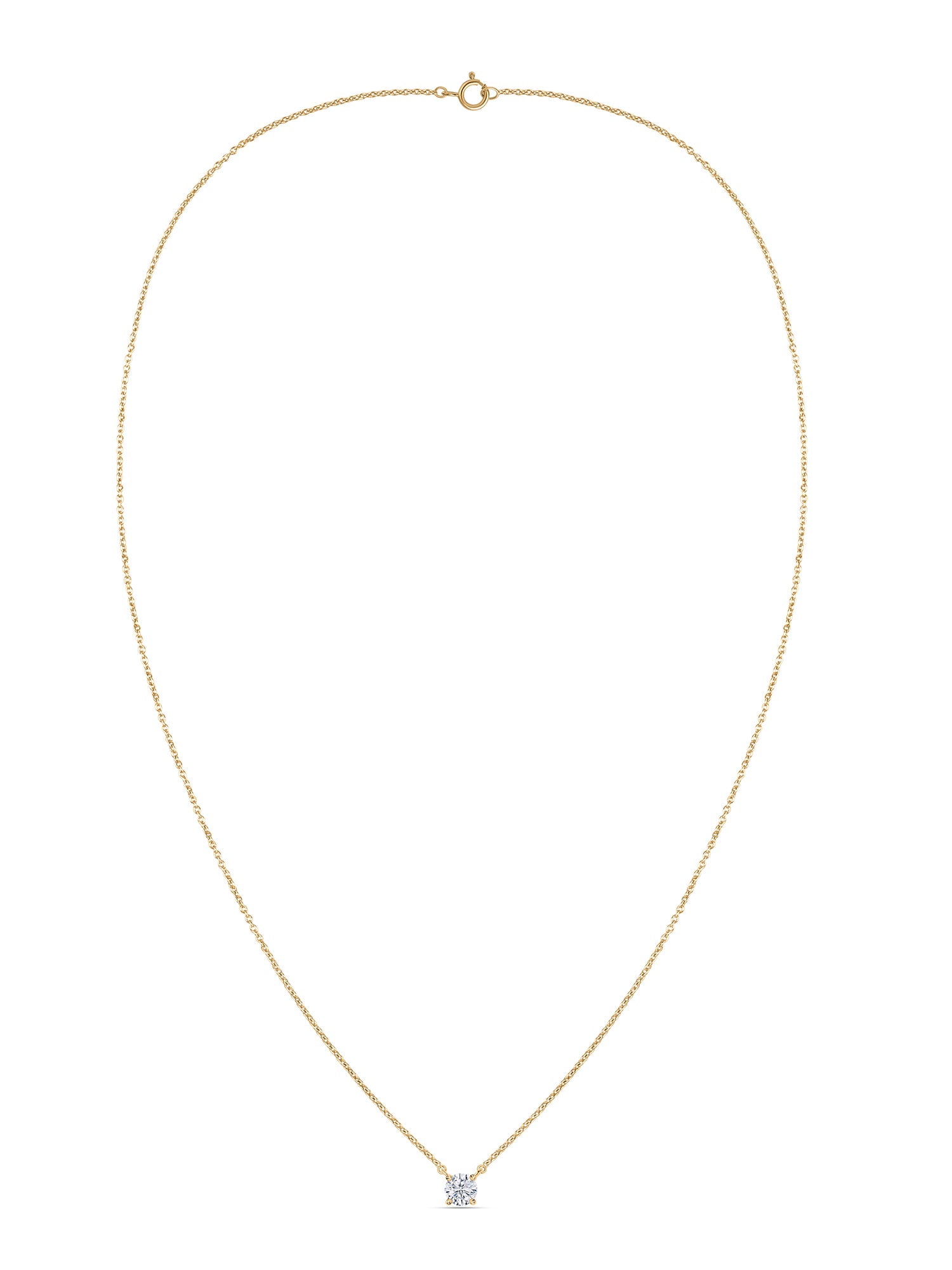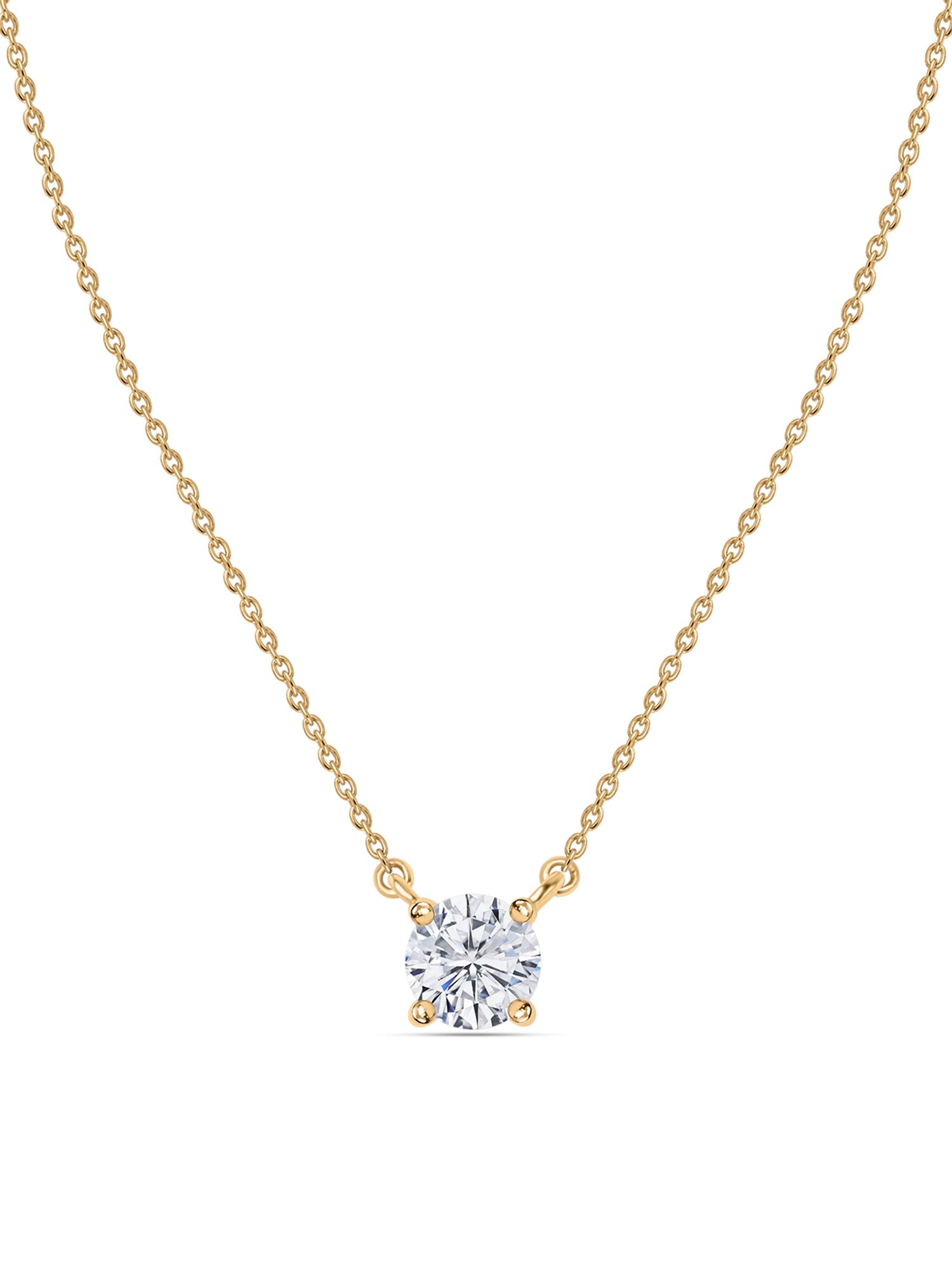 A dainty necklace adorned with a center lab-grown diamond solitaire features a 0.50 carat round FG VVS/VS diamond. Set in pure gold, its minimalist yet classy design is completed with an 18-inch chain and a secure fish lock. A perfect gift for anniversaries, birthdays, or simply to celebrate yourself!