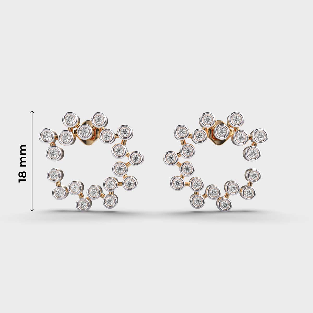 These unique earrings feature a cluster of bezel-set diamonds arranged in an open circular design, crafted in radiant white gold. The artistic and modern style creates a striking yet elegant accessory that is perfect for any occasion.