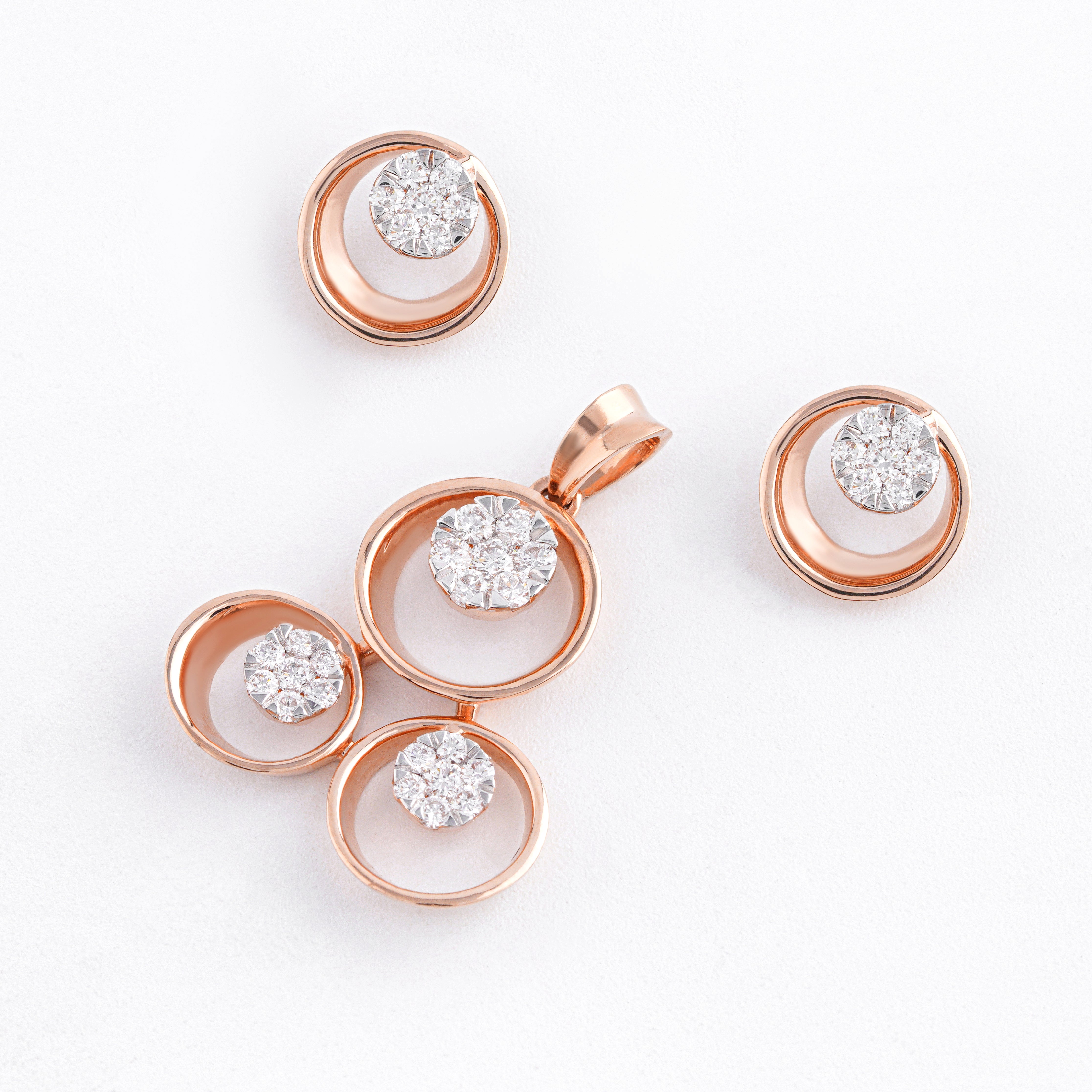 Expertly crafted in rose gold, this gorgeous floral pendant set is adorned with delicate diamonds. The intricate design and stunning sparkle make this a statement piece that will enhance any outfit. Handmade with precision, this pendant set is perfect for those looking for a touch of elegance and sophistication.