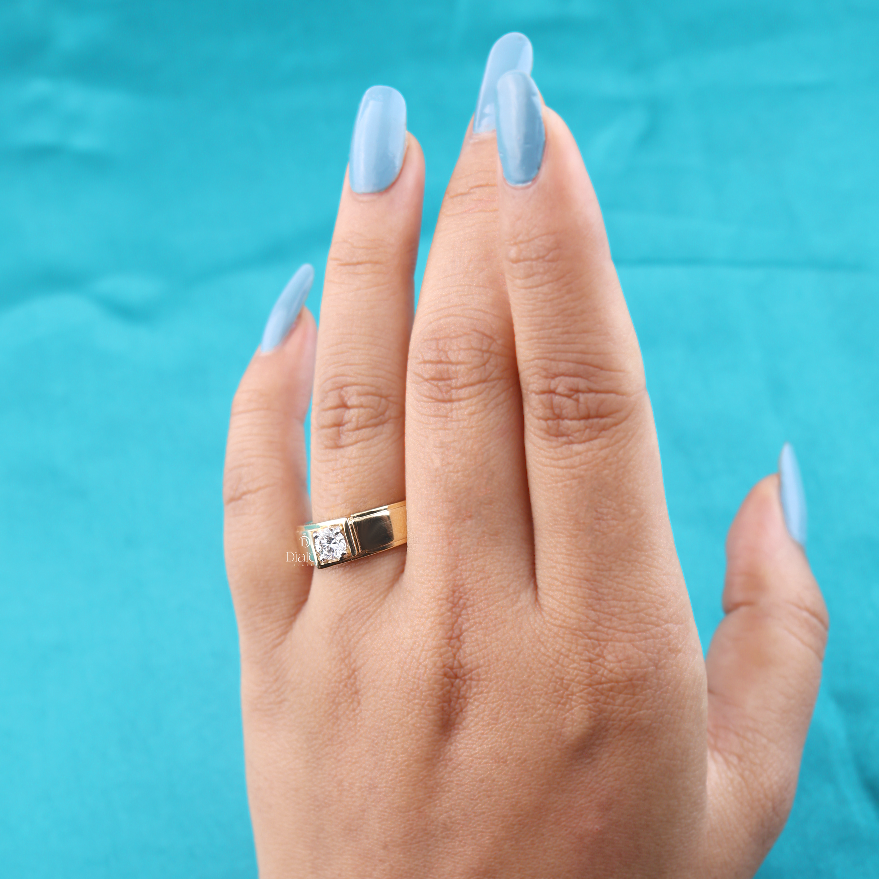 This elegant ring features a timeless two-tone design, blending yellow gold with a sleek white gold centerpiece. At its heart lies a brilliant solitaire diamond that adds a touch of sophistication and sparkle. Perfect for engagements, anniversaries, or as a refined daily wear accessory, this ring symbolizes elegance, love, and everlasting style.