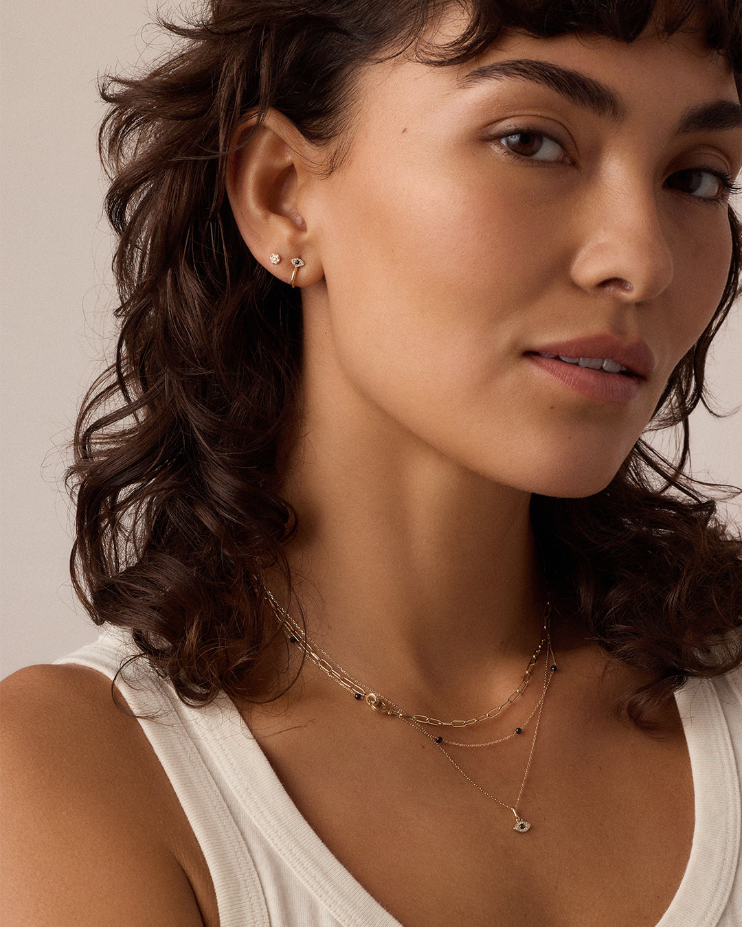 Ward off negativity in style with the Diamond and Blue Sapphire Evil Eye Charm Necklace. Featuring a striking evil eye charm accented with brilliant diamonds and a vibrant blue sapphire, this necklace blends protection with elegance. Perfect for layering or wearing solo, it adds a meaningful and eye-catching touch to any outfit.