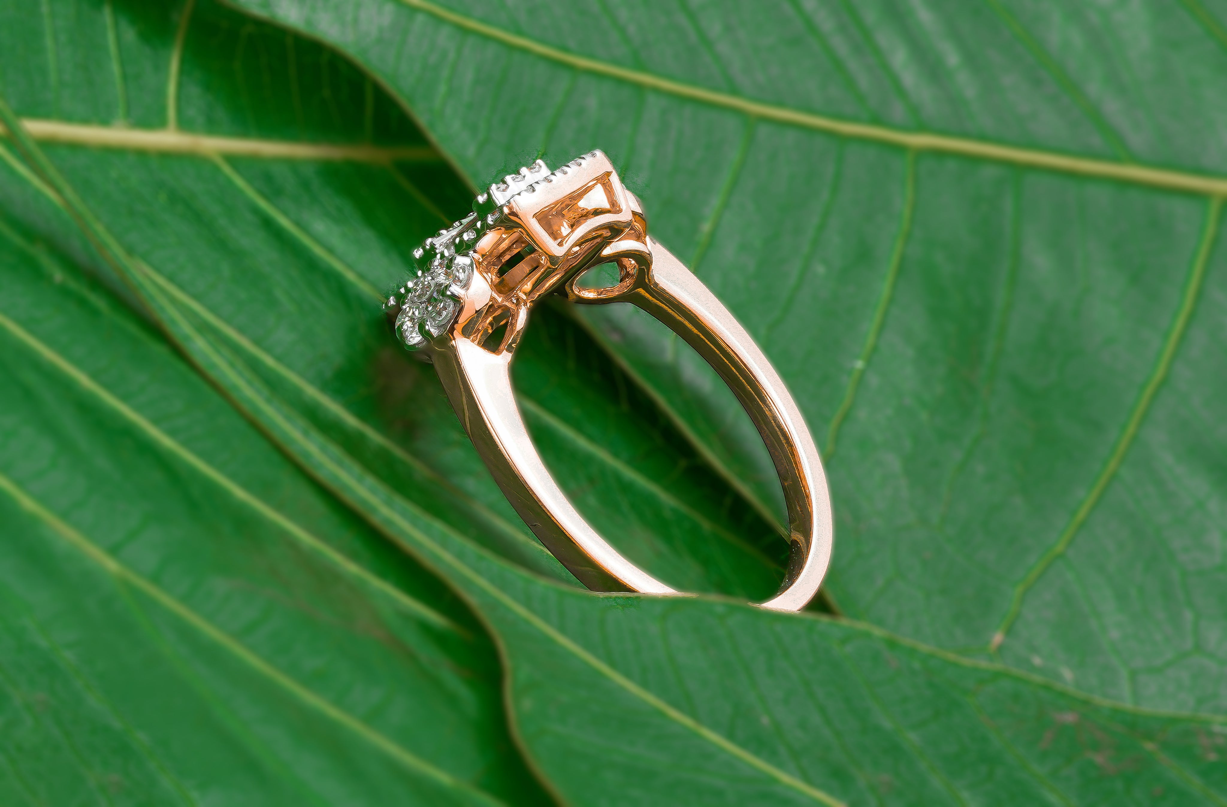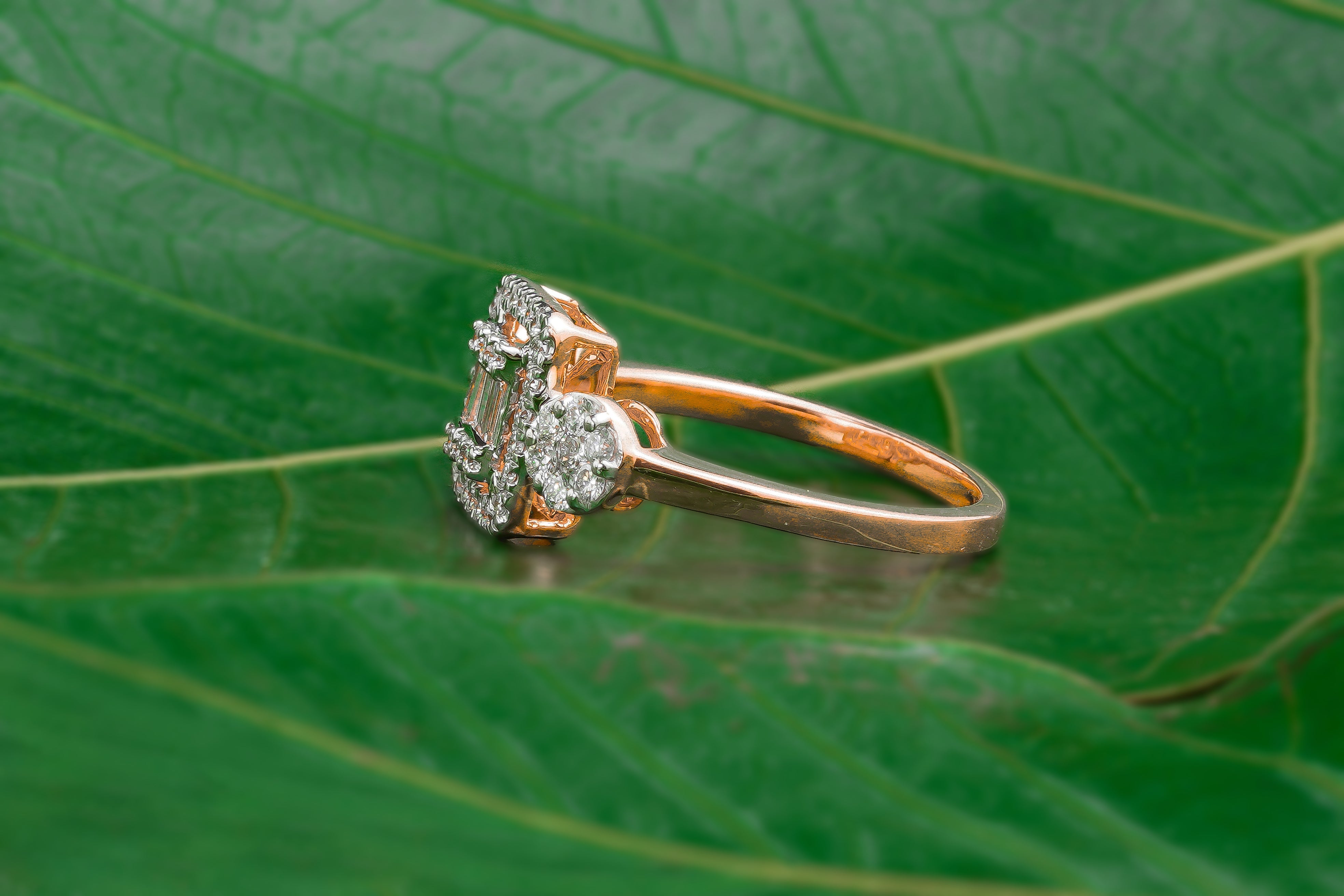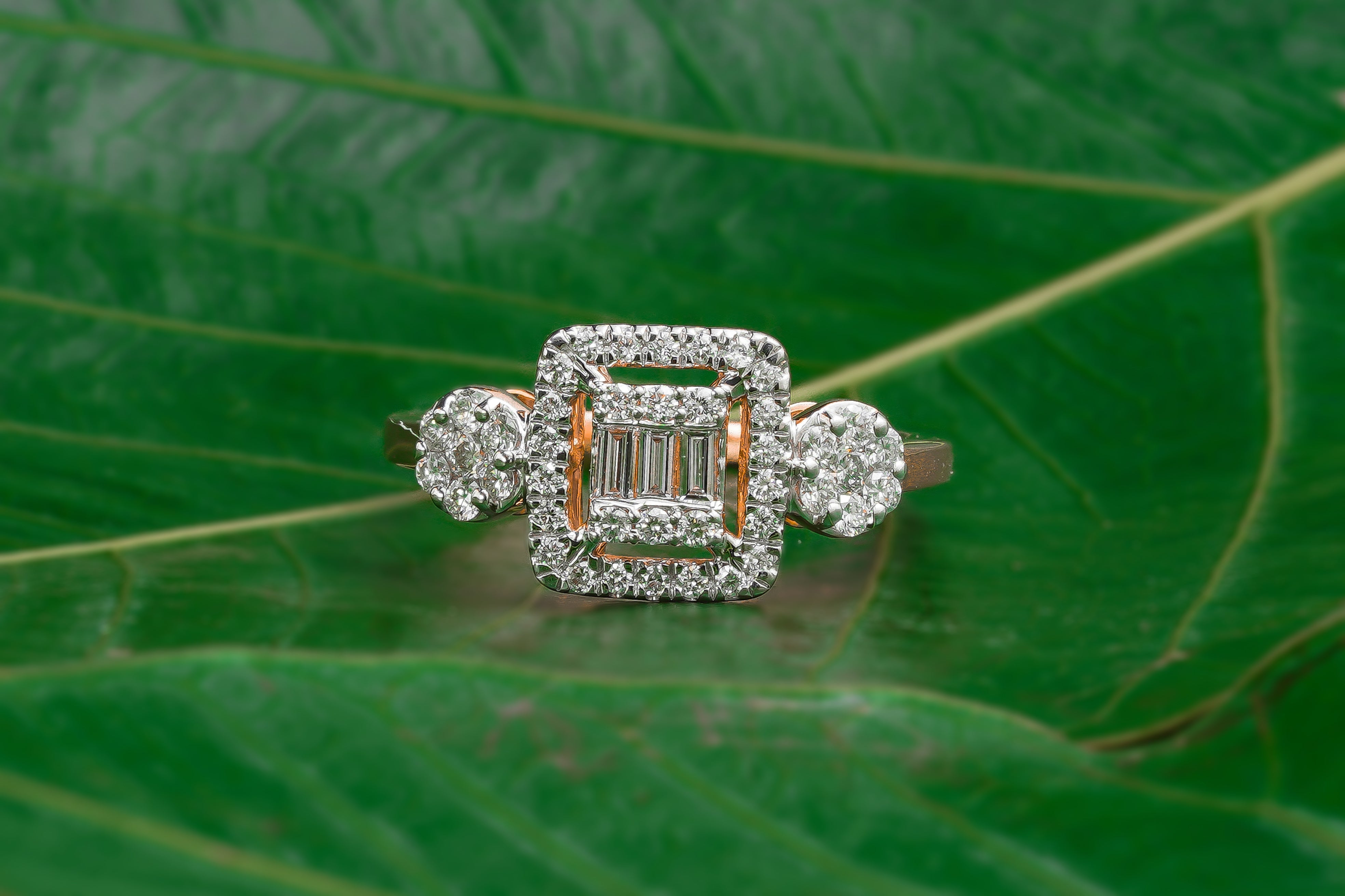This stunning ring features a captivating combination of baguette and round diamonds, beautifully arranged within a halo frame design. The intricate detailing adds depth and brilliance, making it a perfect statement piece for any occasion. Crafted with precision, this ring offers a harmonious blend of modern style and timeless elegance. Ideal for engagements, anniversaries, or as a luxurious gift, this piece ensures you shine with every wear.