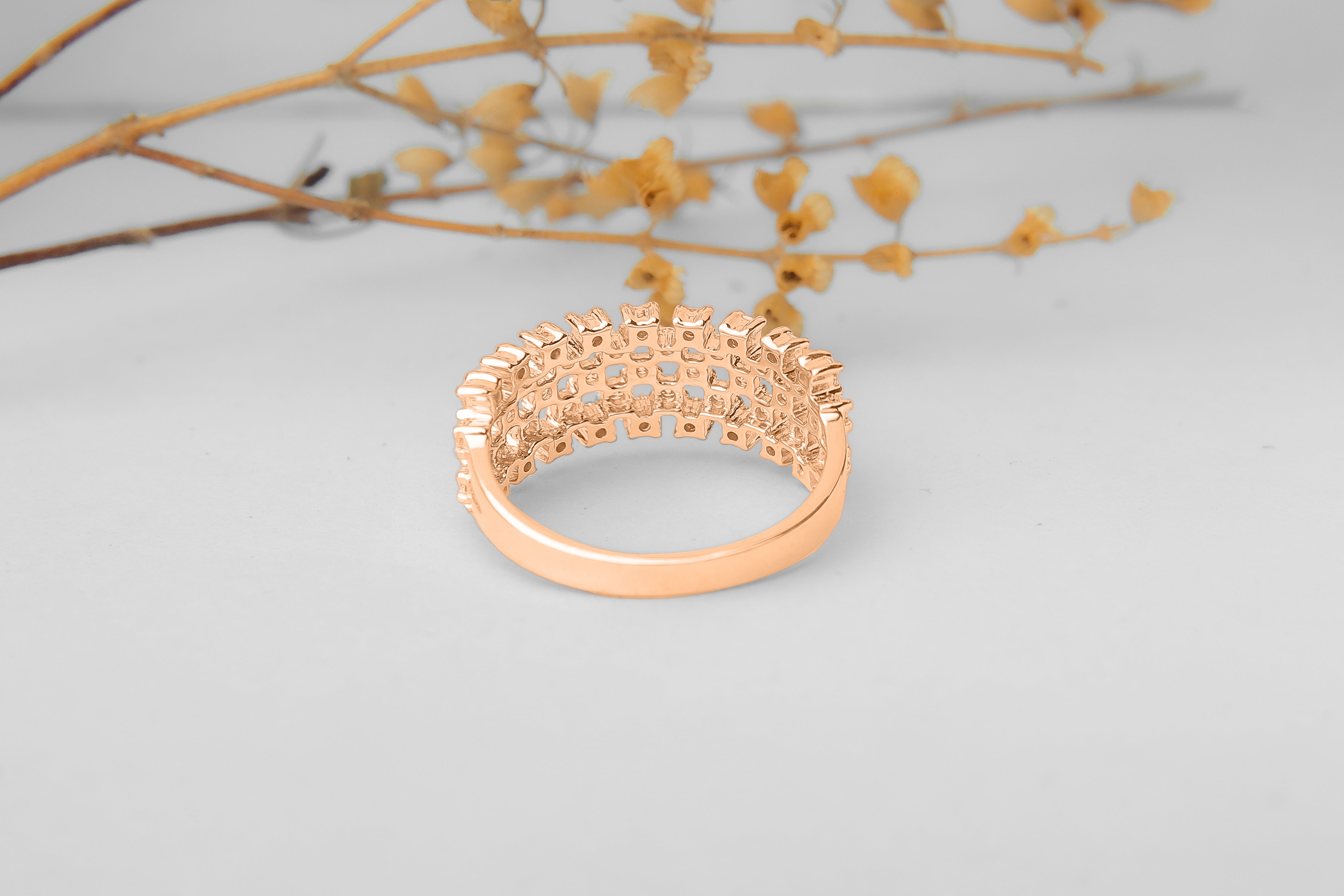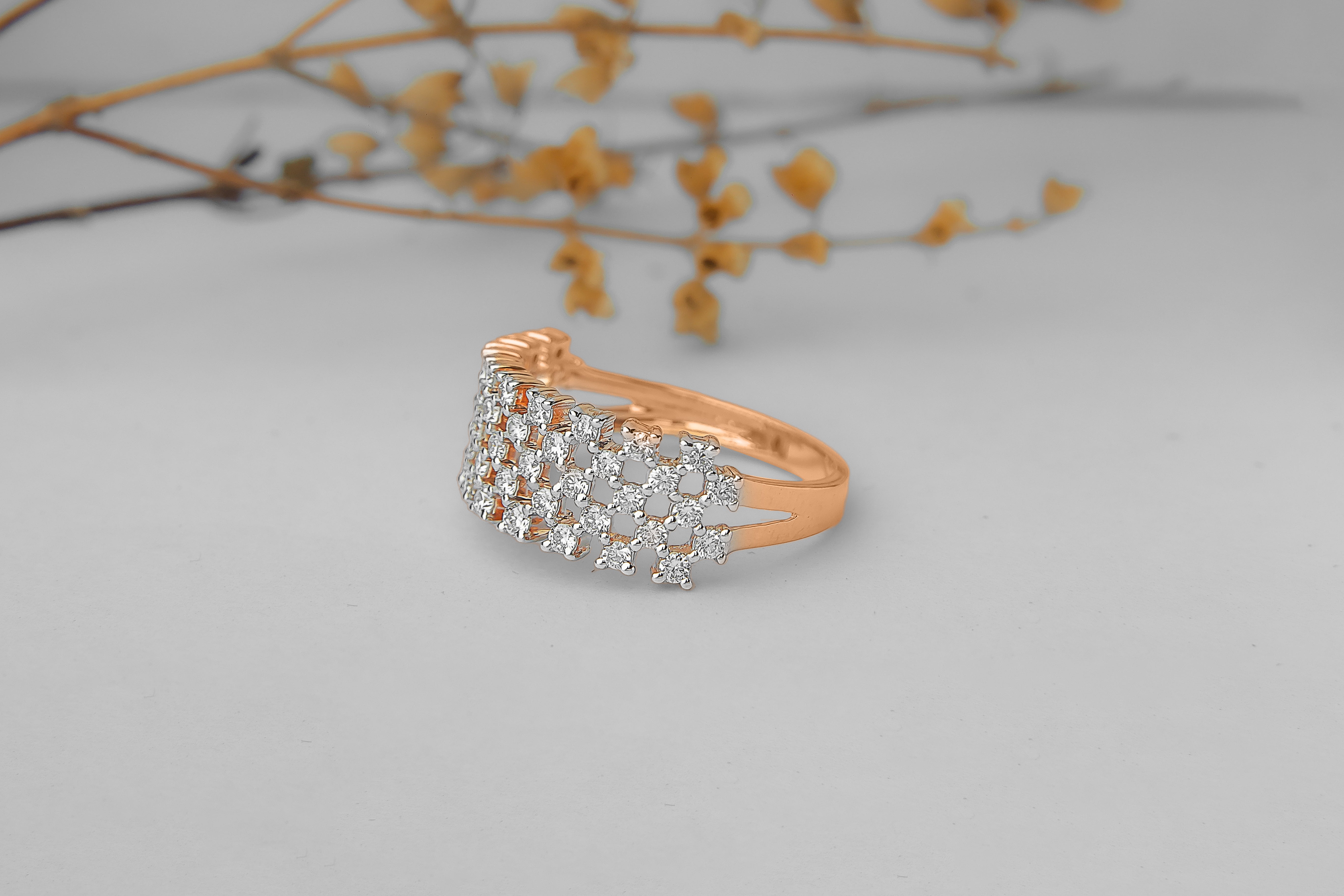 This exquisite wide band ring features a unique arrangement of clustered diamonds, creating a dazzling and elegant shimmer. The split-band design adds a contemporary touch, making it a perfect blend of modern and classic style. Ideal for special occasions or everyday luxury, this piece radiates sophistication and charm.