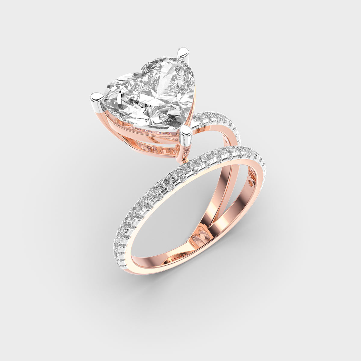 Gemstones: Heart-shaped center diamond with pavé round diamonds along the band