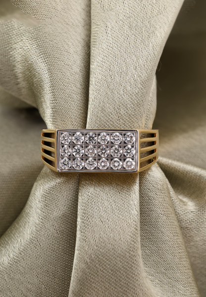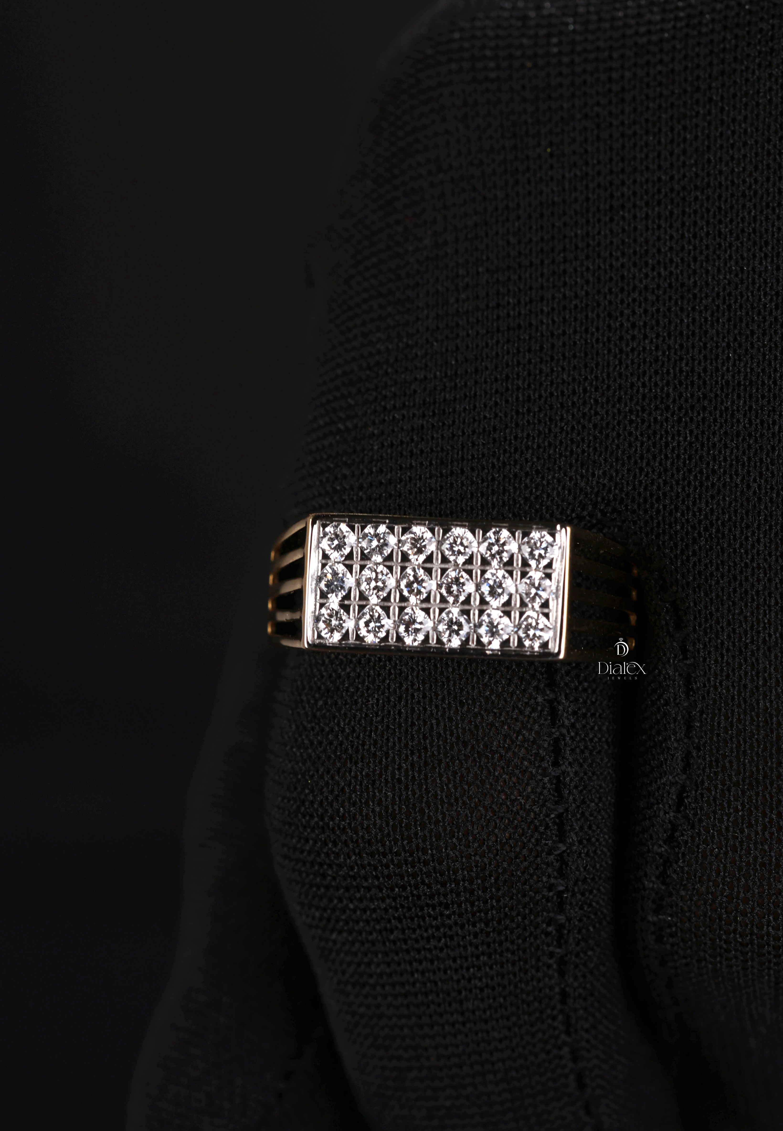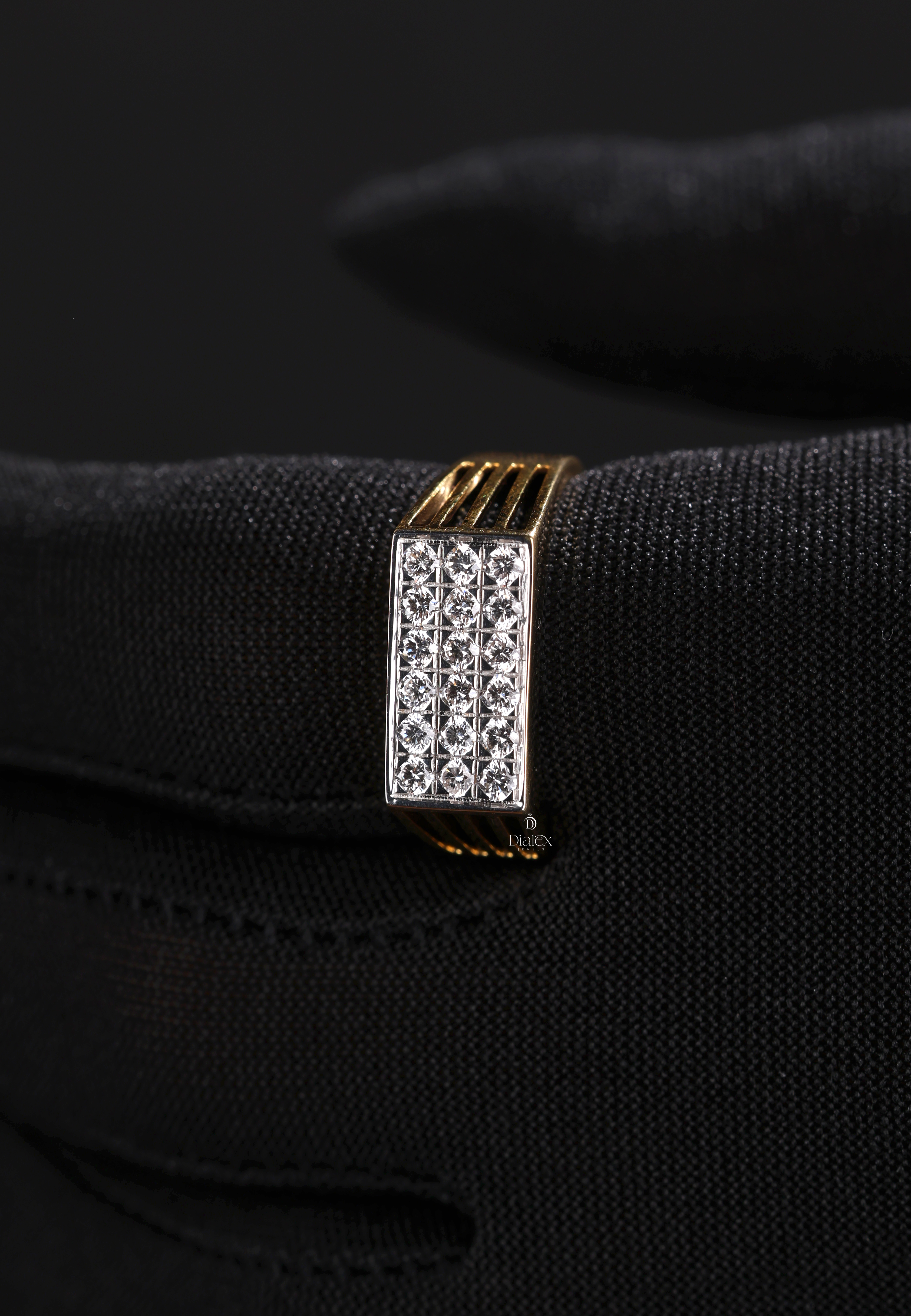 Elevate your style with this luxurious men’s diamond ring crafted in 18K yellow gold. The centerpiece features a striking rectangular face, meticulously set with 15 brilliant-cut diamonds arranged in a cluster for maximum sparkle and sophistication. The sleek gold band with triple-cut side detailing adds a modern and masculine touch, making it perfect for both formal occasions and daily wear. A statement piece that combines timeless elegance with bold design, this ring is ideal for the man who values refinement and luxury.