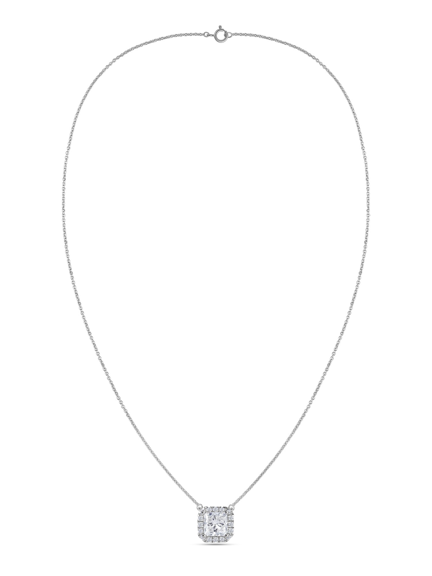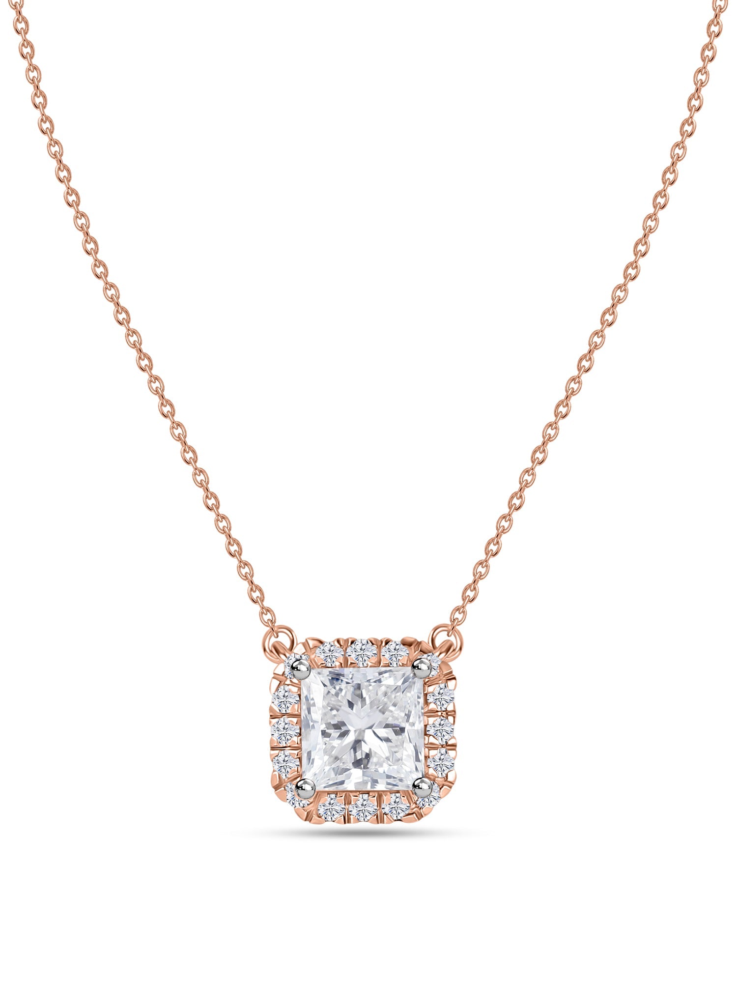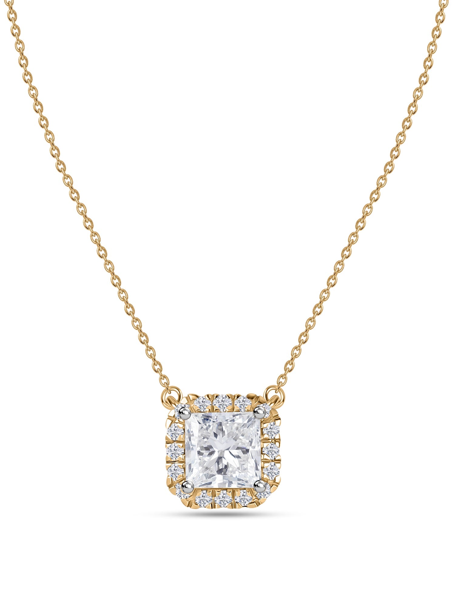 A radiant sparkle for your neck. This princess-cut lab-grown diamond is meticulously cut to maximize brilliance from every angle. It has small diamonds on the side, creating a nice halo. It has a nice and perfect Gold Setting. This necklace complements every skin tone and style. Great to be paired with your informal and formal, so you can shine and sparkle daily