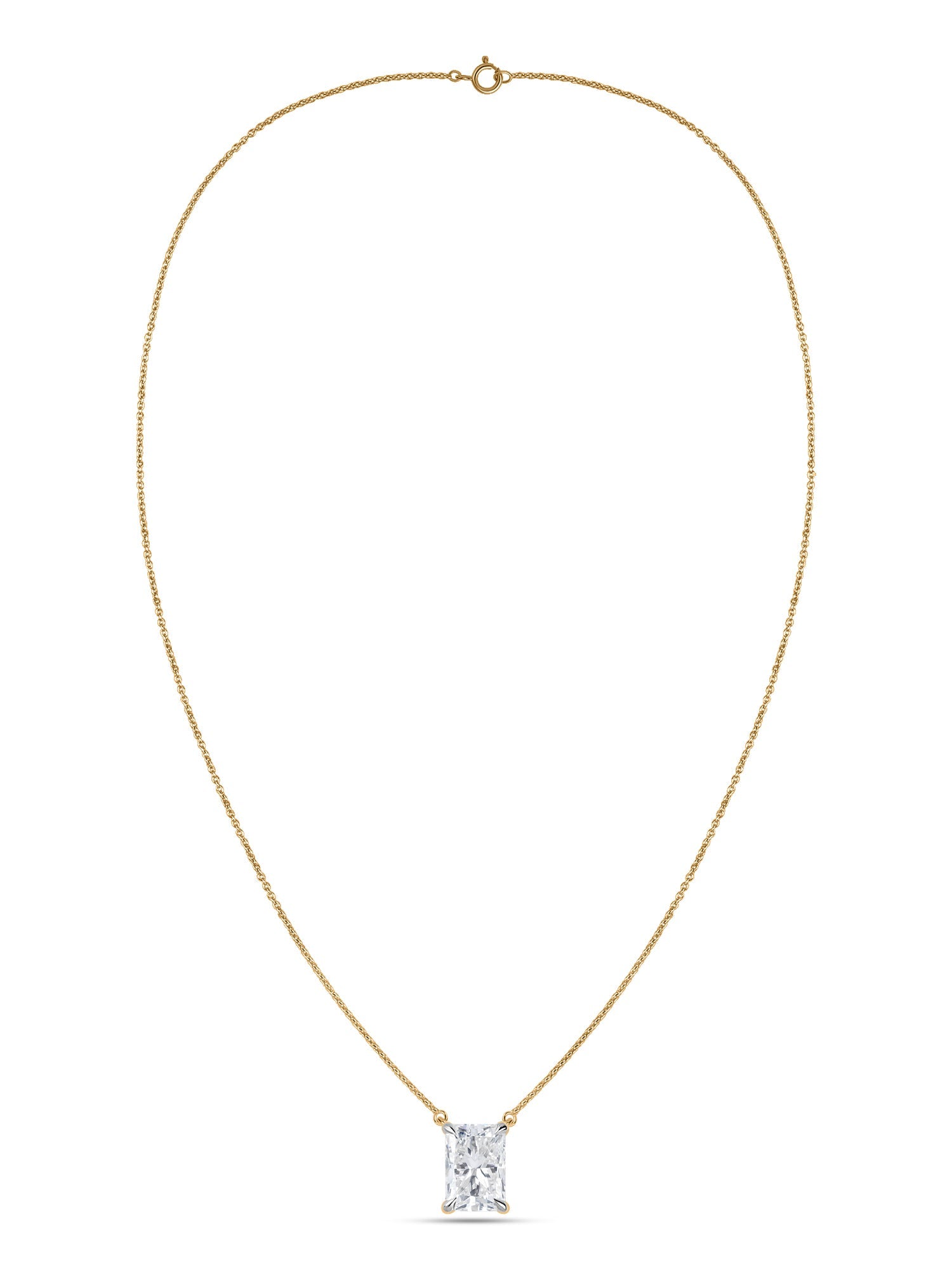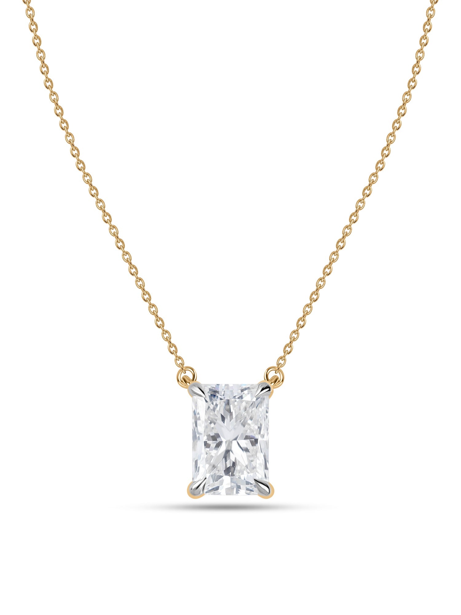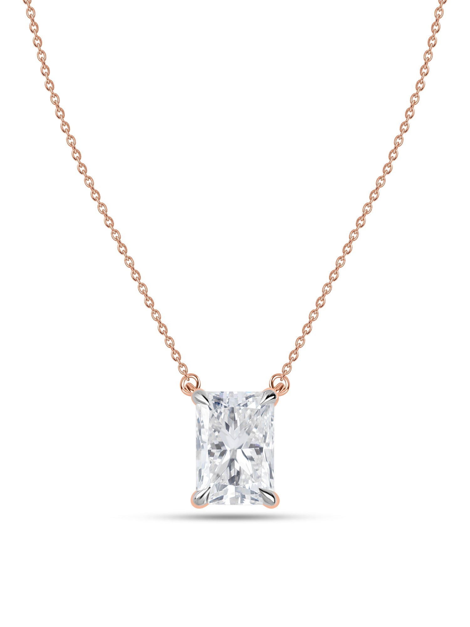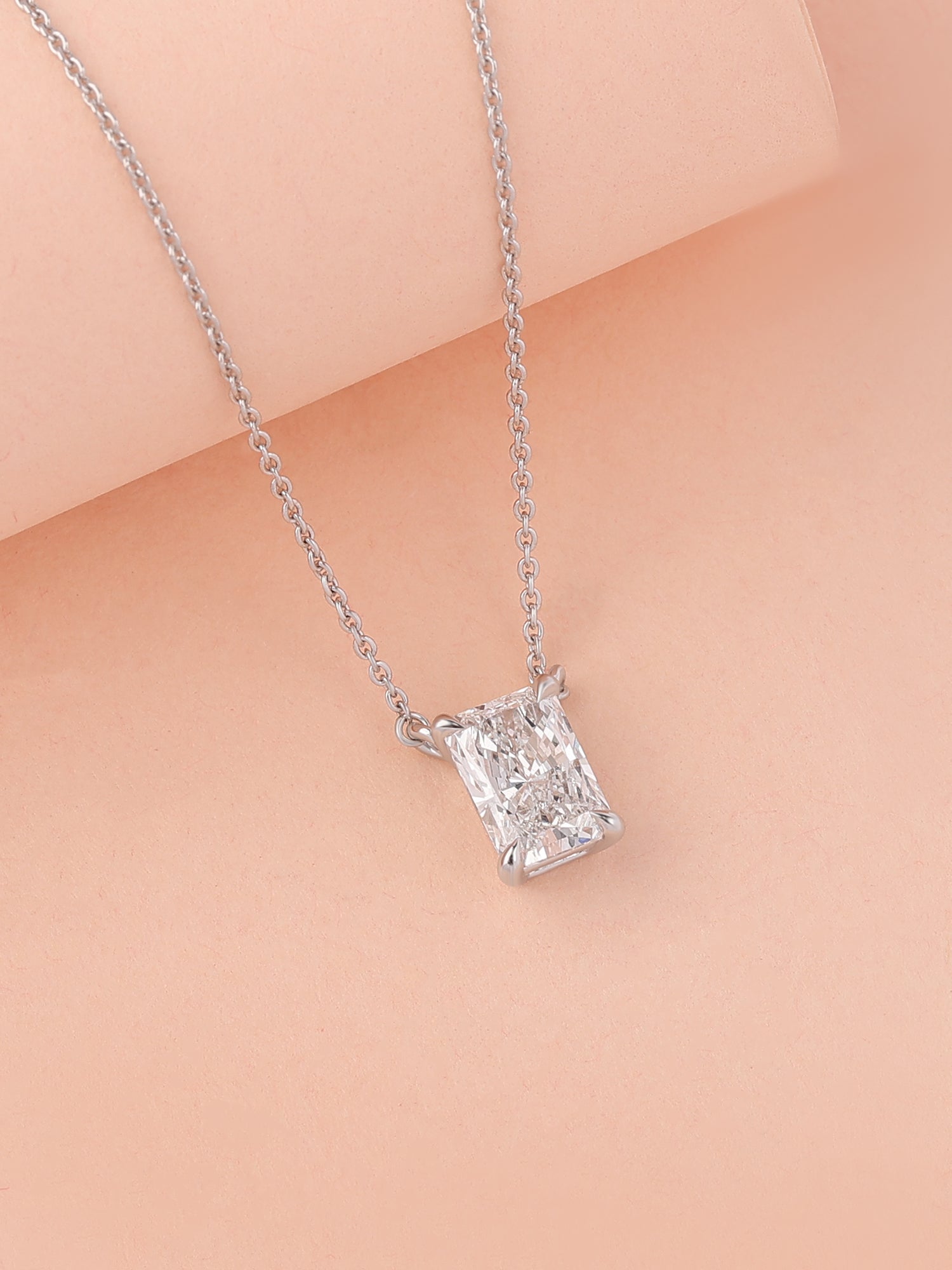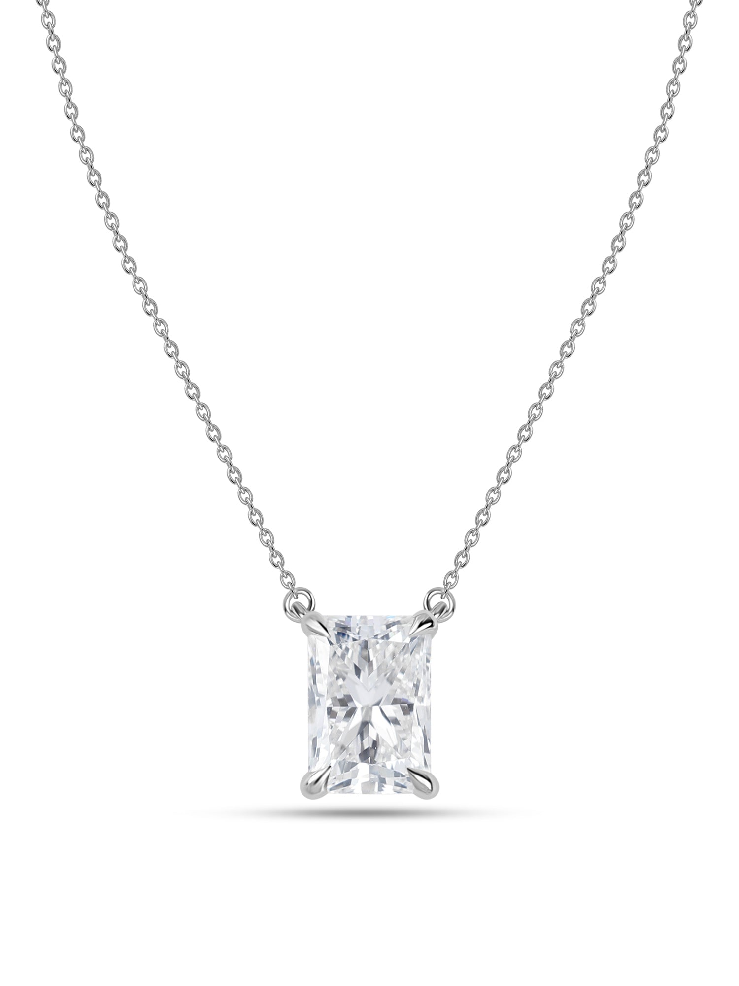 A radiant, cut, sparkling, gorgeous necklace for your neck. This radiant-cut lab-grown diamond is precisely cut to maximize shine and brilliance from every angle that shines around your neck.