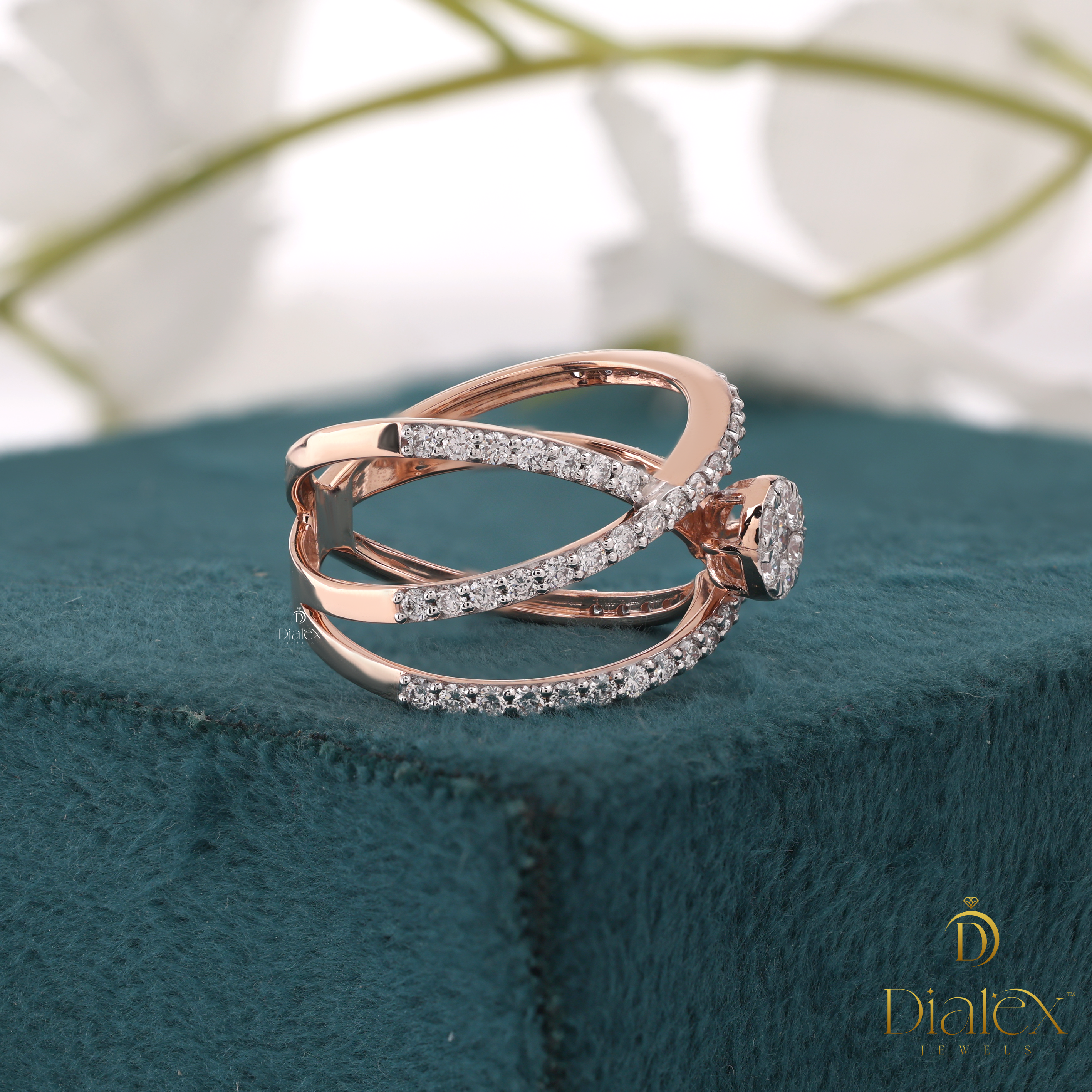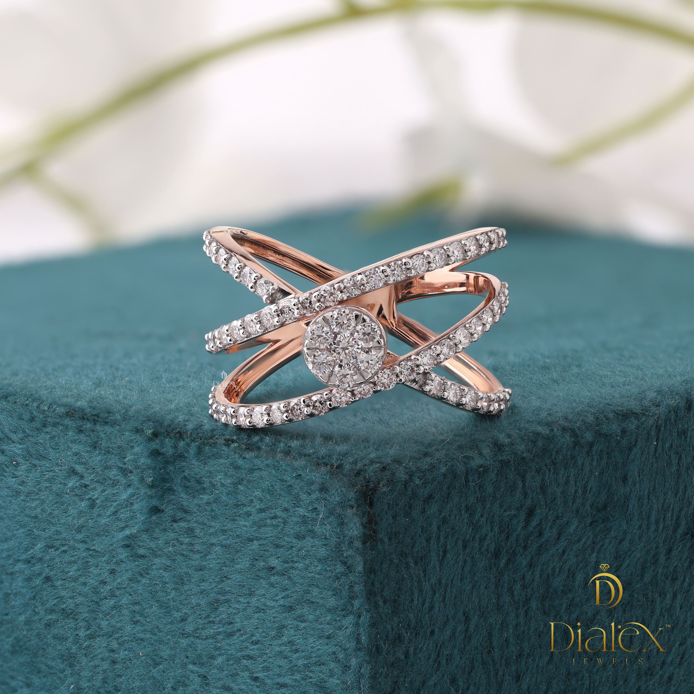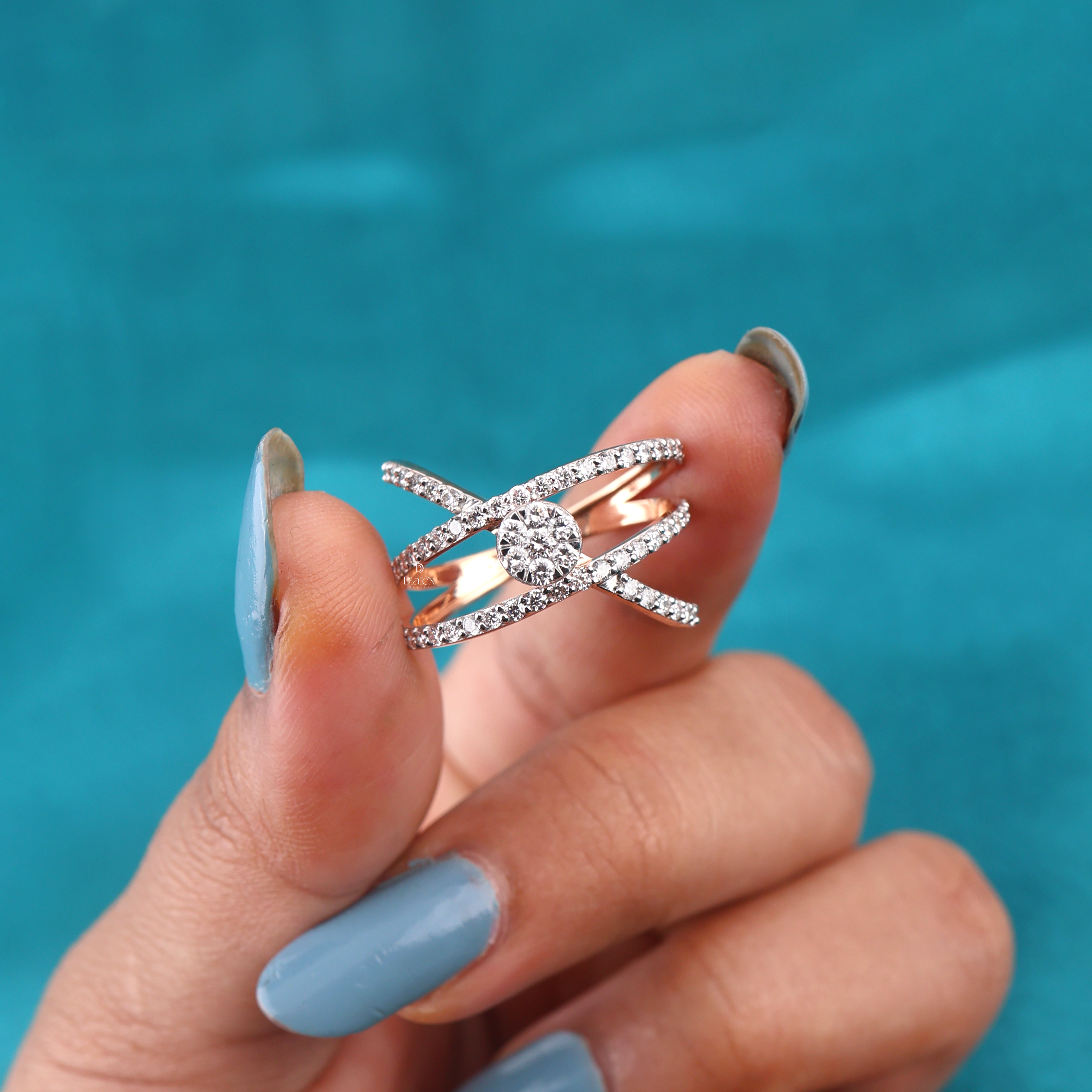 A modern masterpiece, this criss-cross diamond ring is crafted in luxurious rose gold and designed to captivate. Featuring intertwining diamond-studded bands that gracefully cross over, the ring is centered with a sparkling round diamond cluster for added brilliance. Its elegant and contemporary design makes it a perfect choice for women who love unique yet timeless jewelry. Ideal for parties, special occasions, or as a statement piece for everyday elegance.
