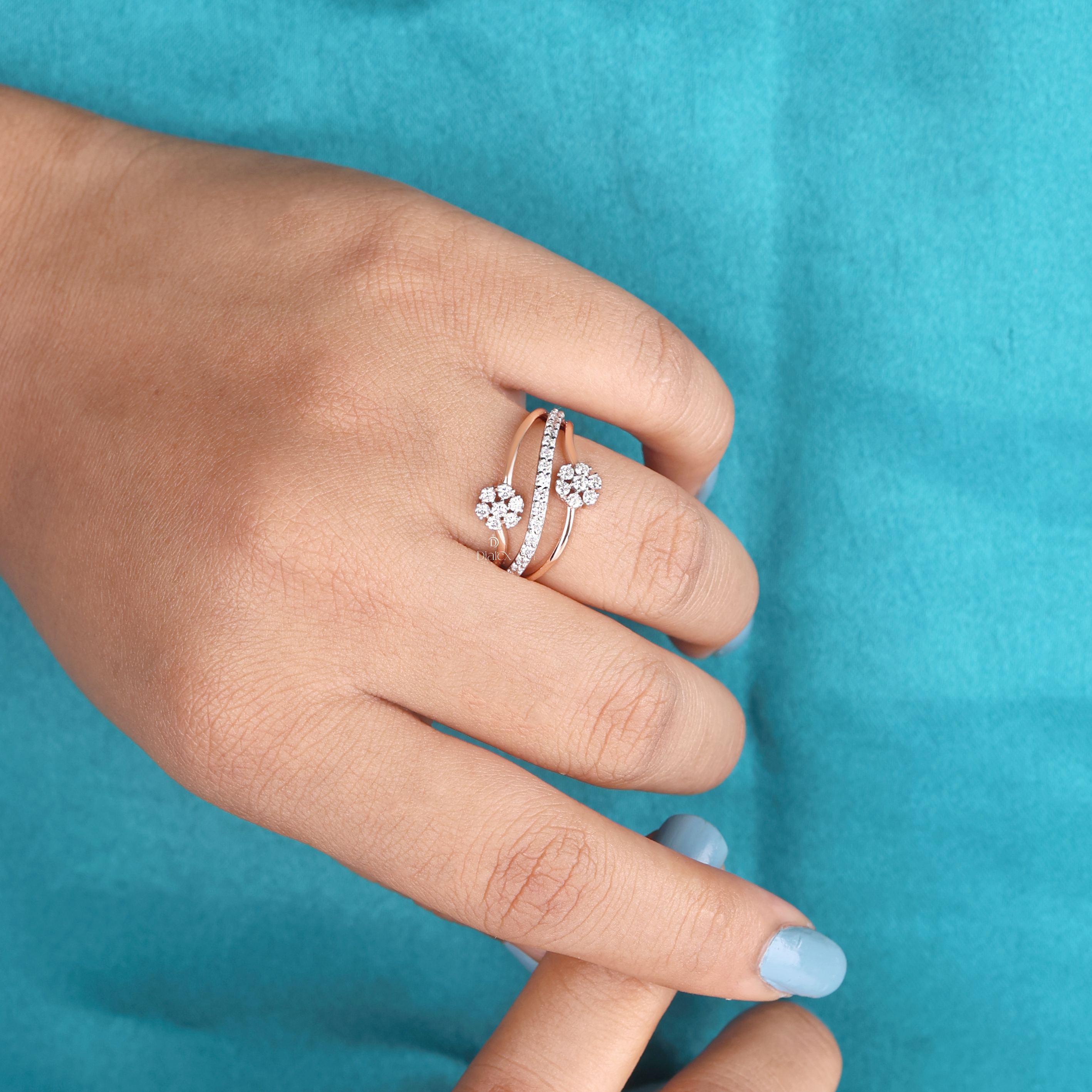 This graceful ring showcases a stunning floral-inspired design, crafted in elegant rose gold. At its center sits a brilliant round diamond cluster, enhanced by a delicate swirl of diamond-studded bands that wrap beautifully around the finger. The unique blend of floral charm and modern curves makes it a perfect accessory for both special occasions and everyday sophistication. A timeless symbol of elegance and beauty.