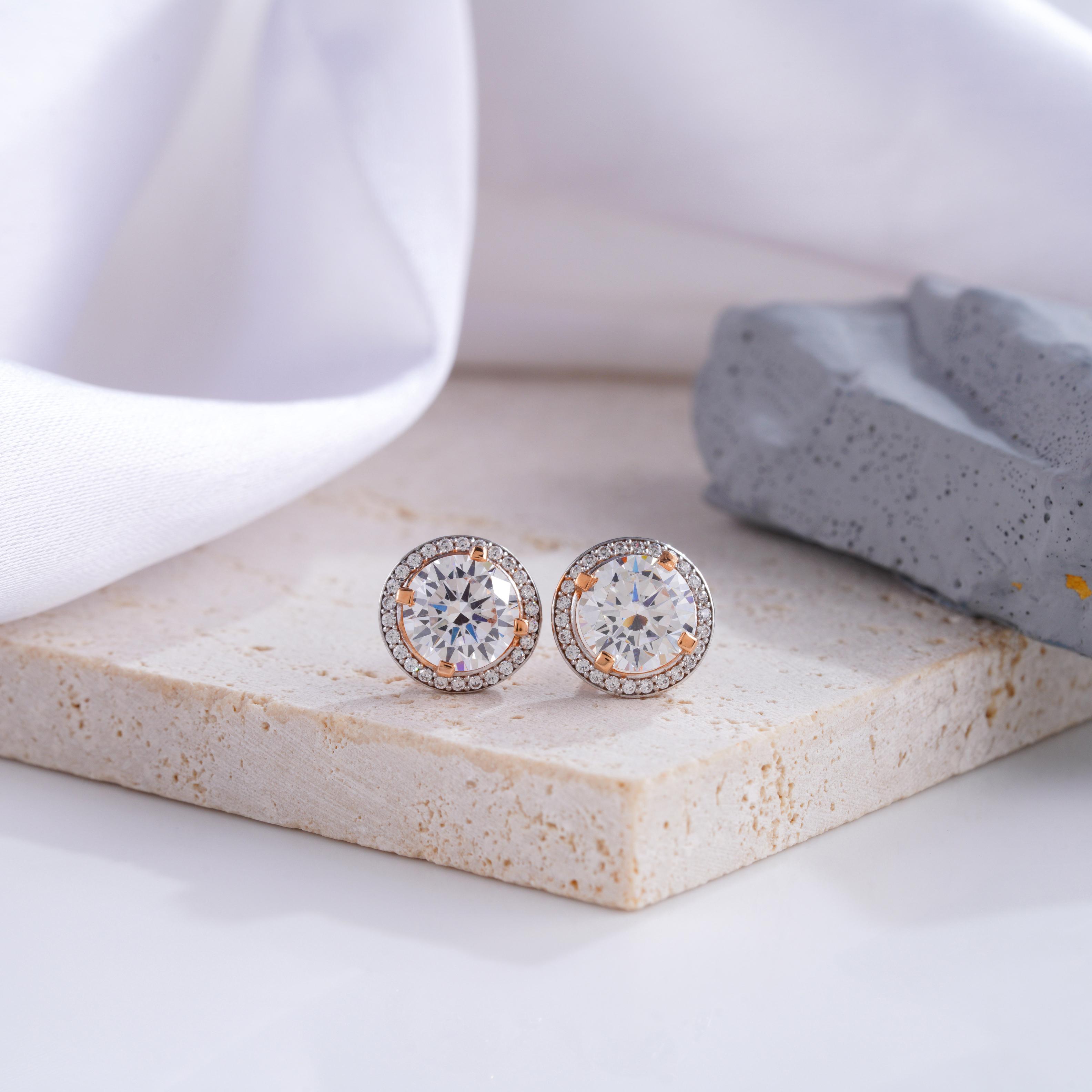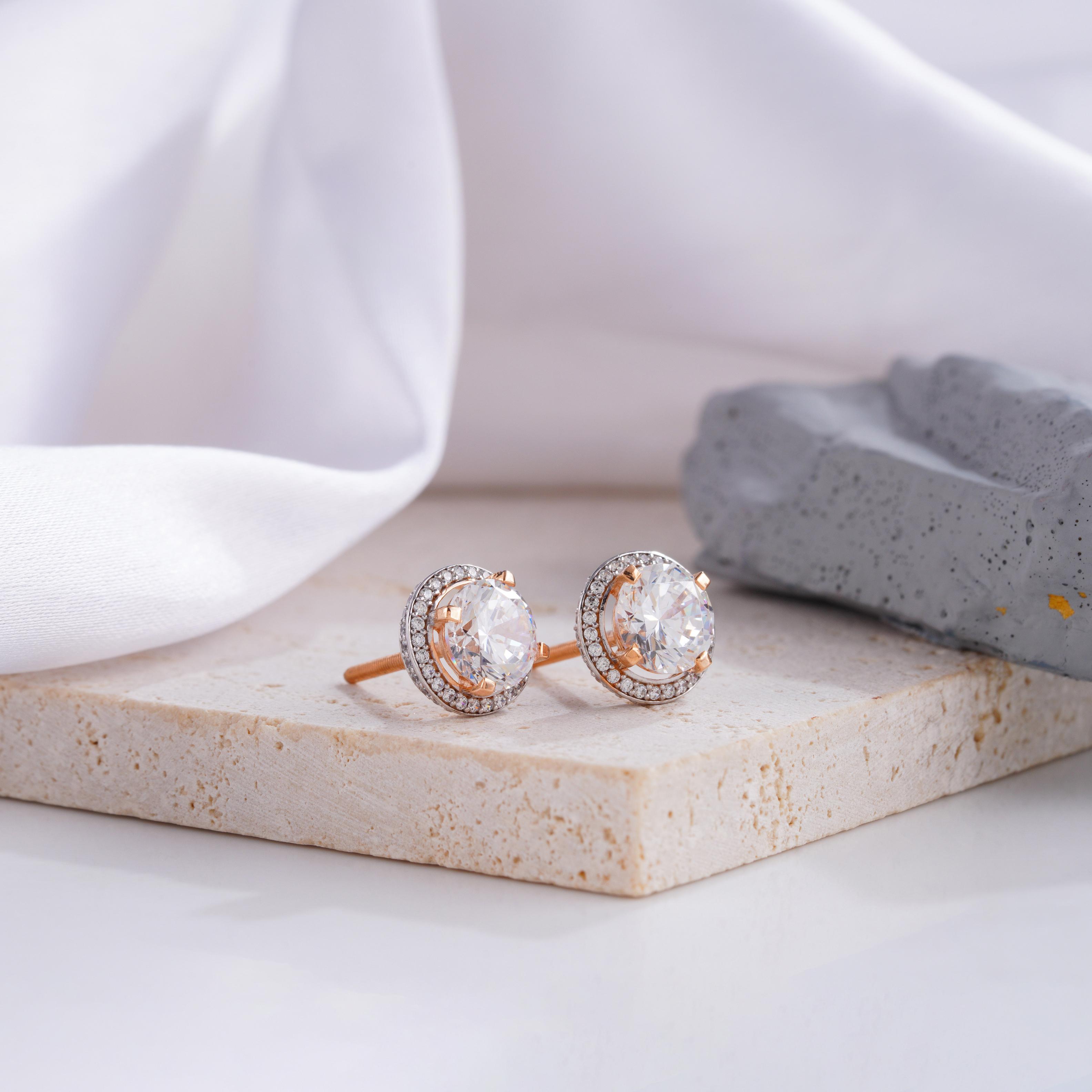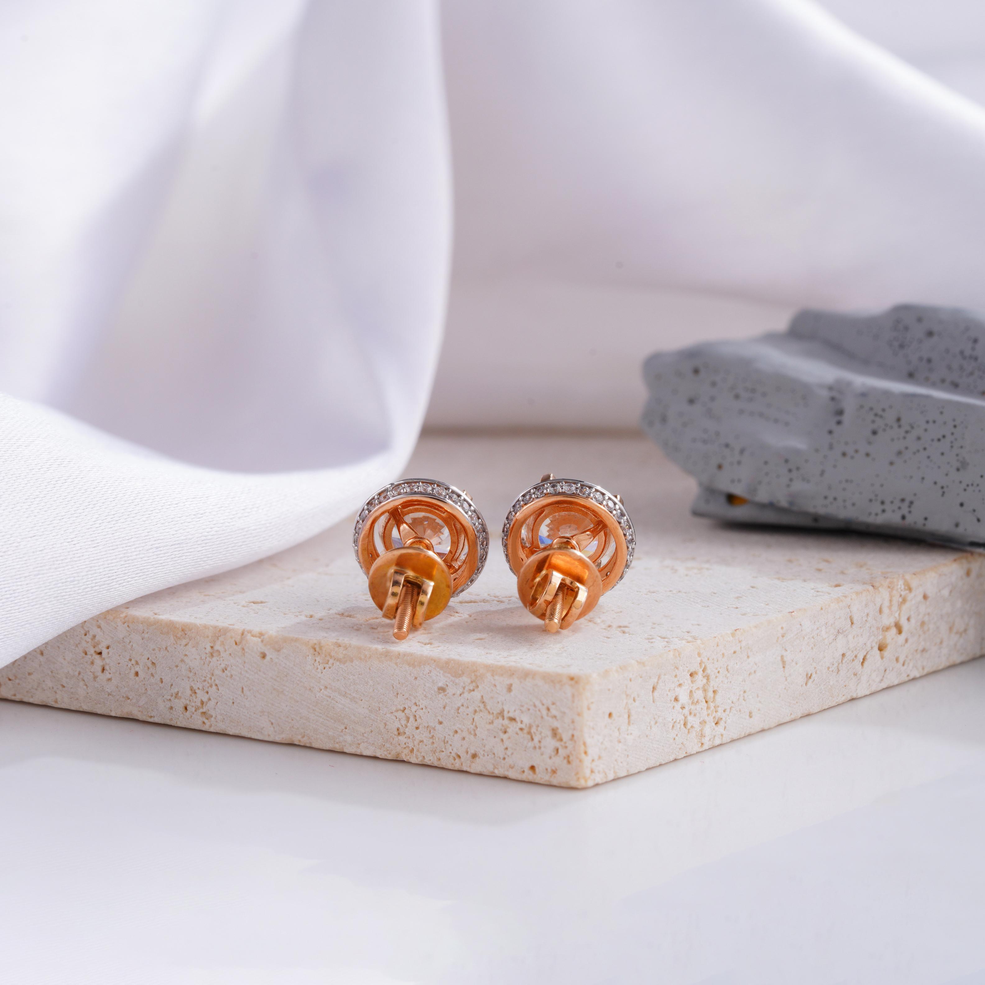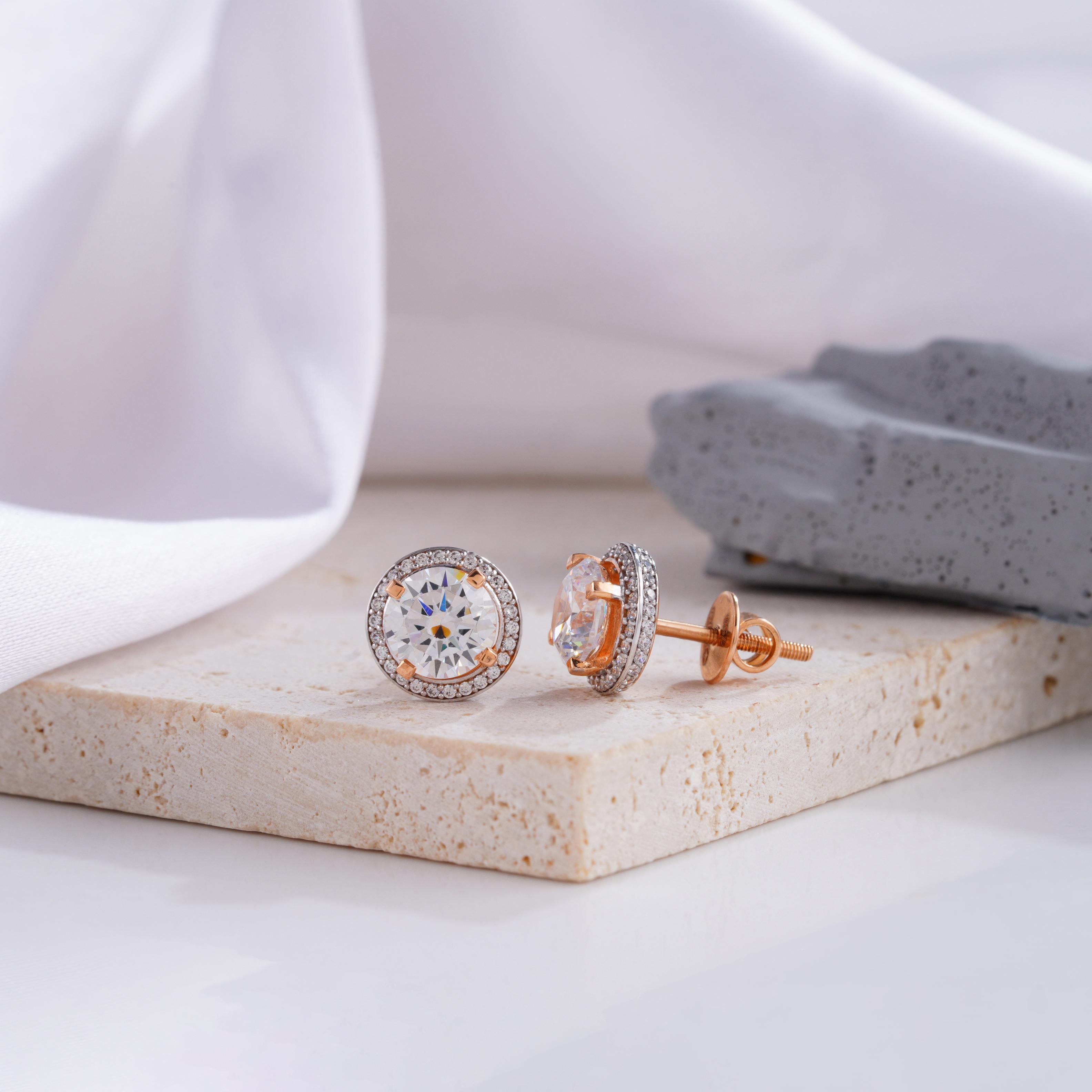 These exquisite round diamond stud earrings are encircled by a shimmering halo of smaller diamonds, amplifying the brilliance and allure of the center stones. The addition of delicate rose gold prongs adds a subtle yet striking contrast, enhancing the overall elegance of the design. Perfect for both day-to-night wear, these earrings are a must-have for those who seek classic beauty with a touch of modern sophistication. Whether for a special occasion or daily glamour, these studs are a timeless statement.