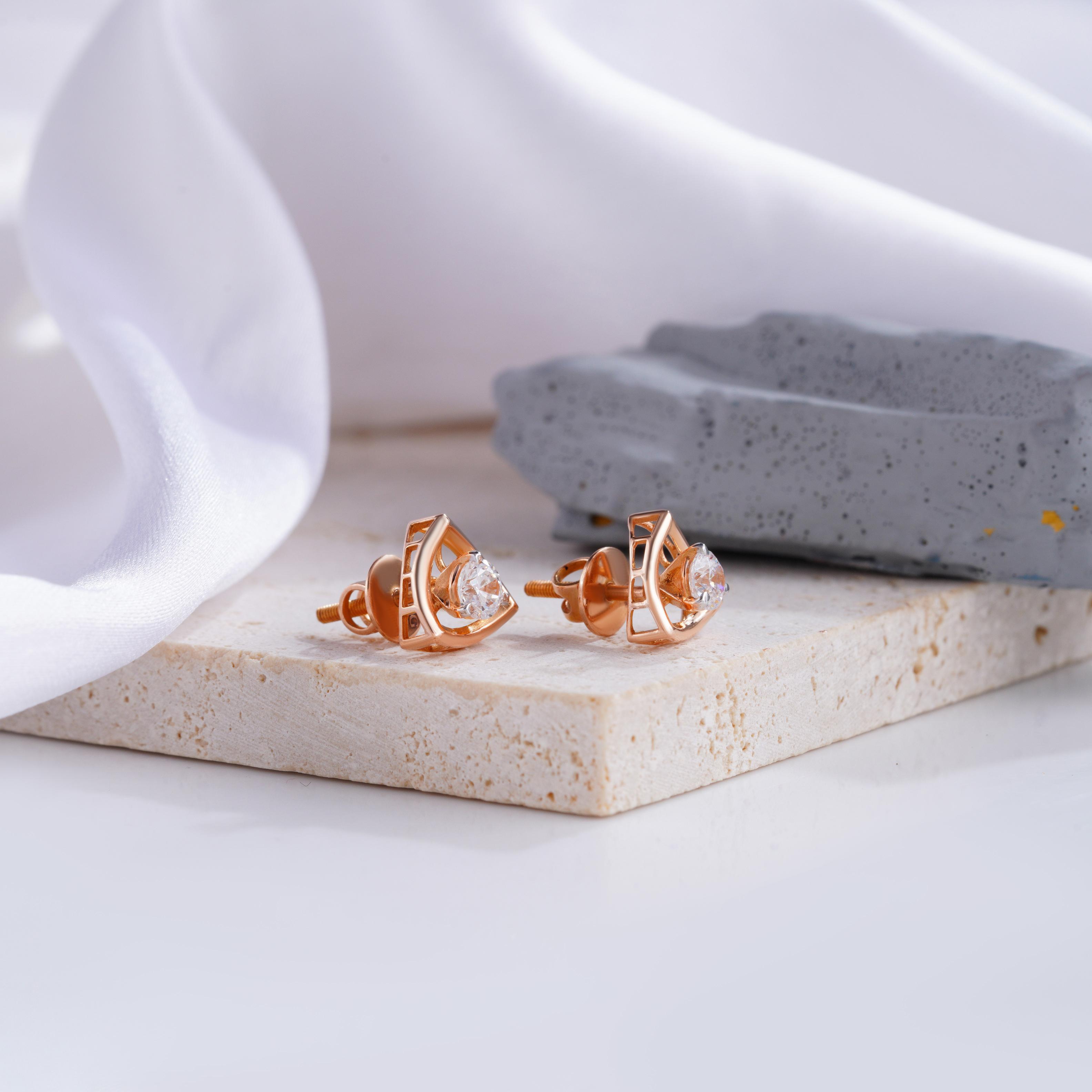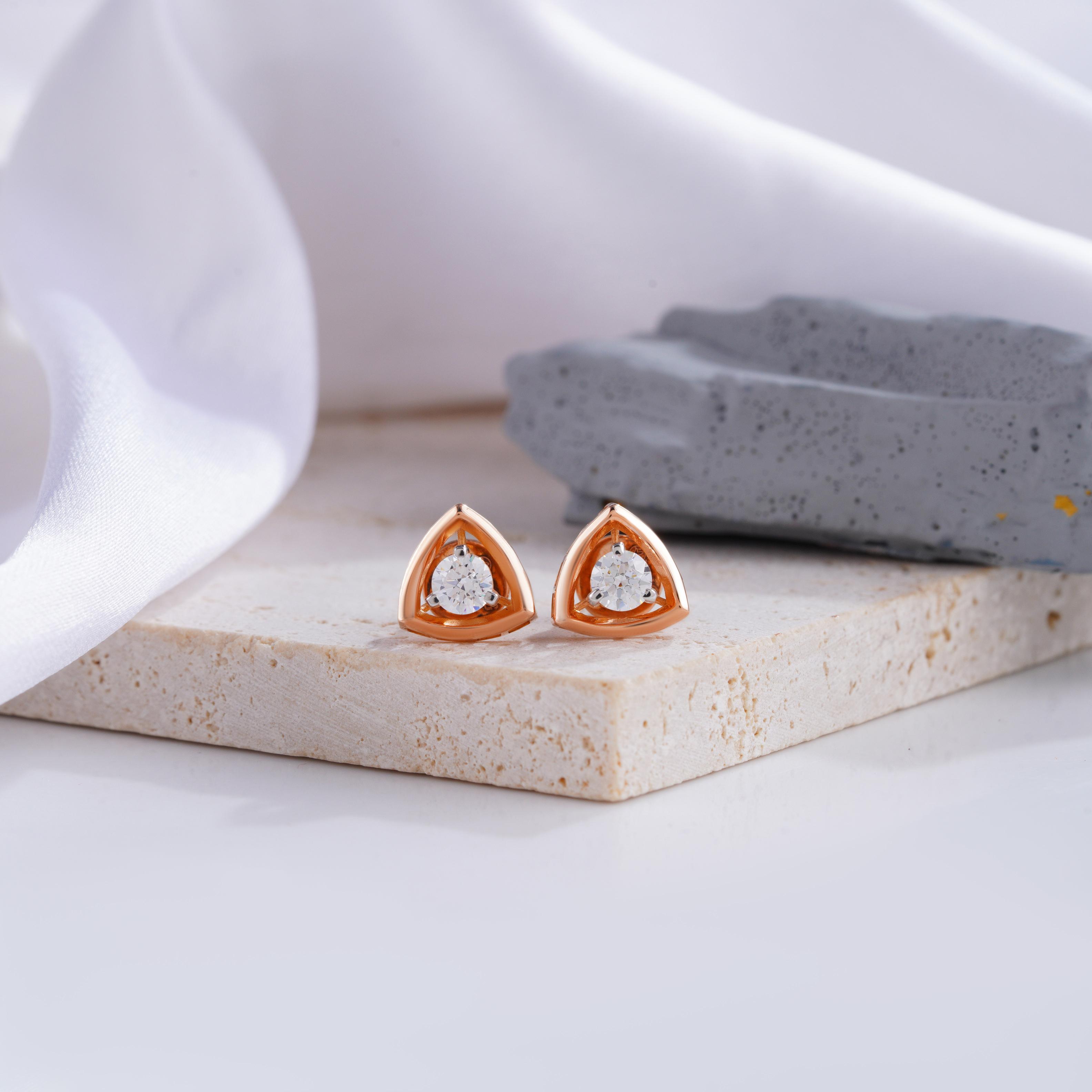 These striking diamond stud earrings feature a captivating triangular bezel setting, delicately crafted in warm rose gold. The sleek and contemporary design frames the sparkling diamonds perfectly, creating a look that is both bold and refined. The bezel setting offers a secure fit while allowing maximum light to enhance the brilliance of the diamonds. These earrings make a stylish and elegant choice for both everyday wear and special occasions, adding a modern twist to your jewelry collection.