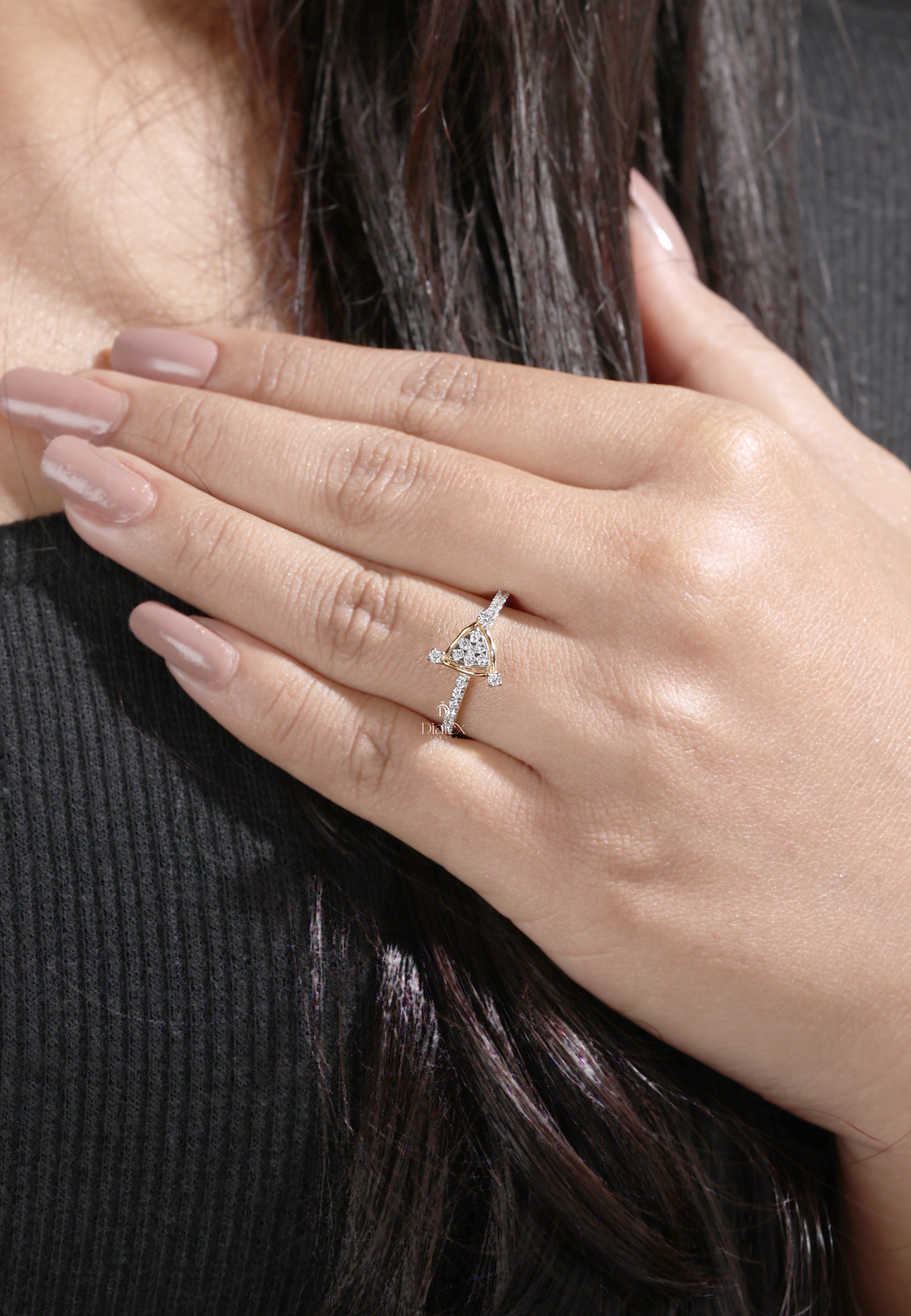 A unique expression of modern elegance, this exquisite ring features a dazzling triangular diamond cluster set within a delicate yellow gold frame. The band is encrusted with brilliant round-cut diamonds, adding endless sparkle and sophistication. Blending white and yellow gold tones, this design creates a striking contrast that is both contemporary and timeless. Perfect as an engagement ring or a standout fashion statement, it symbolizes individuality, elegance, and everlasting love.