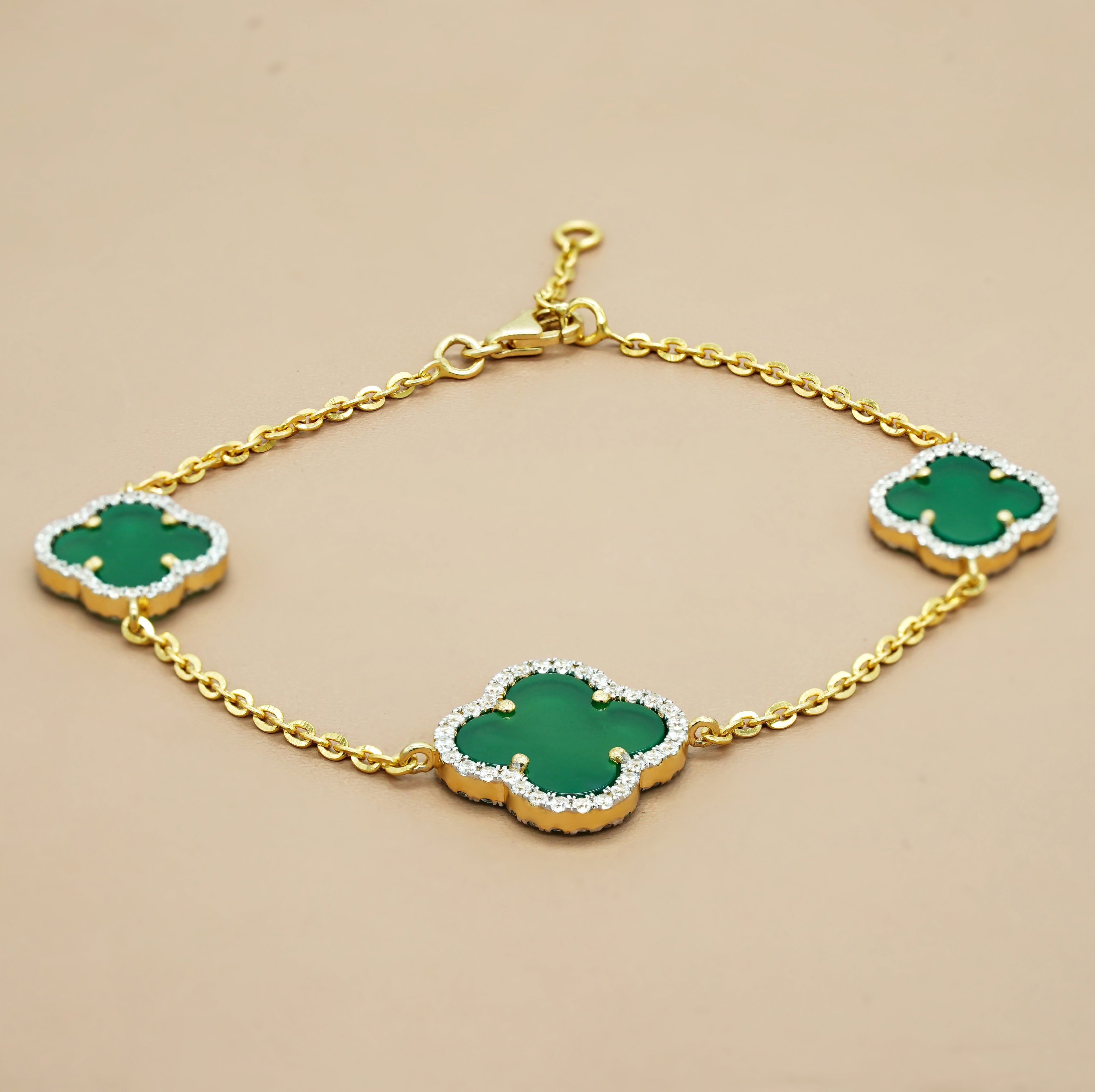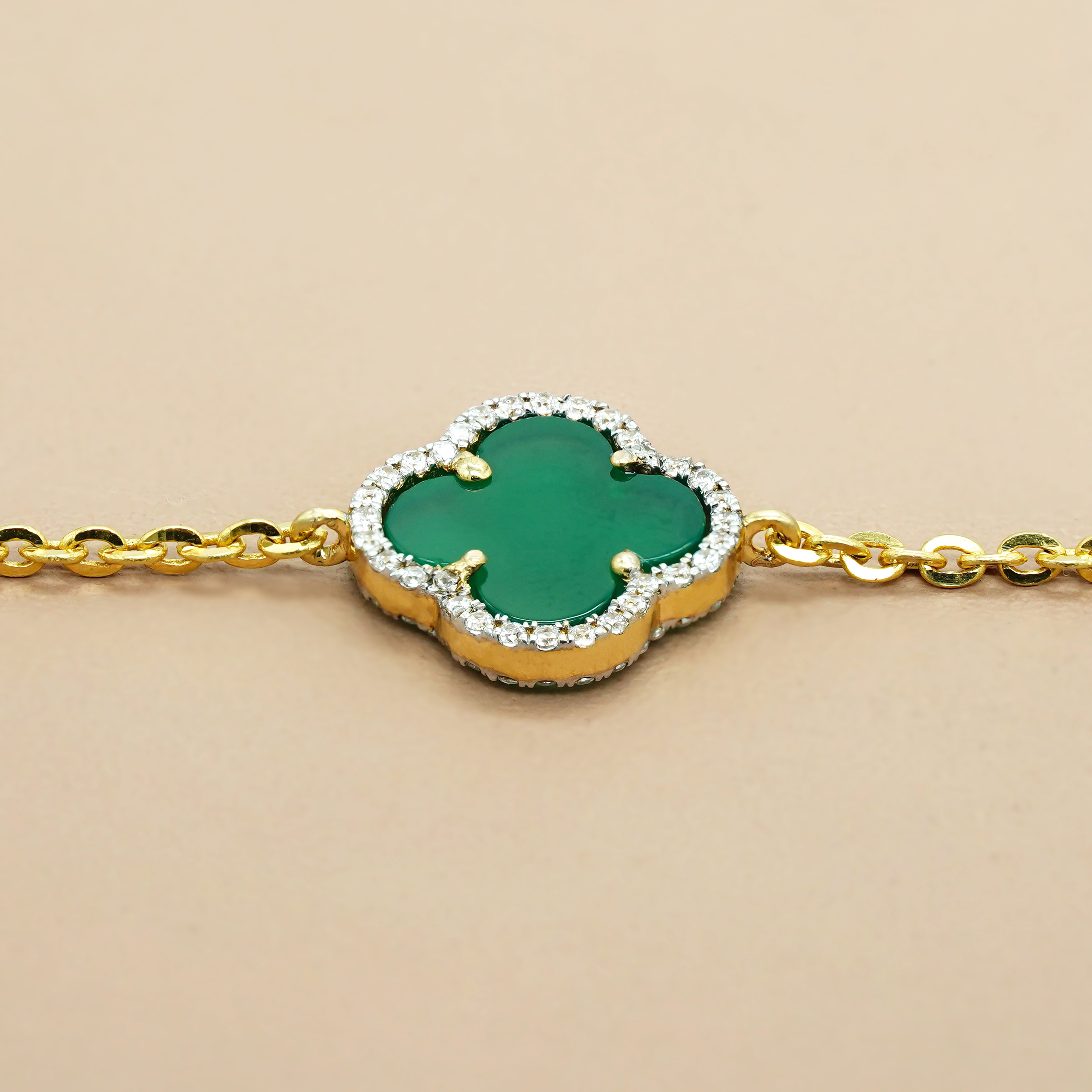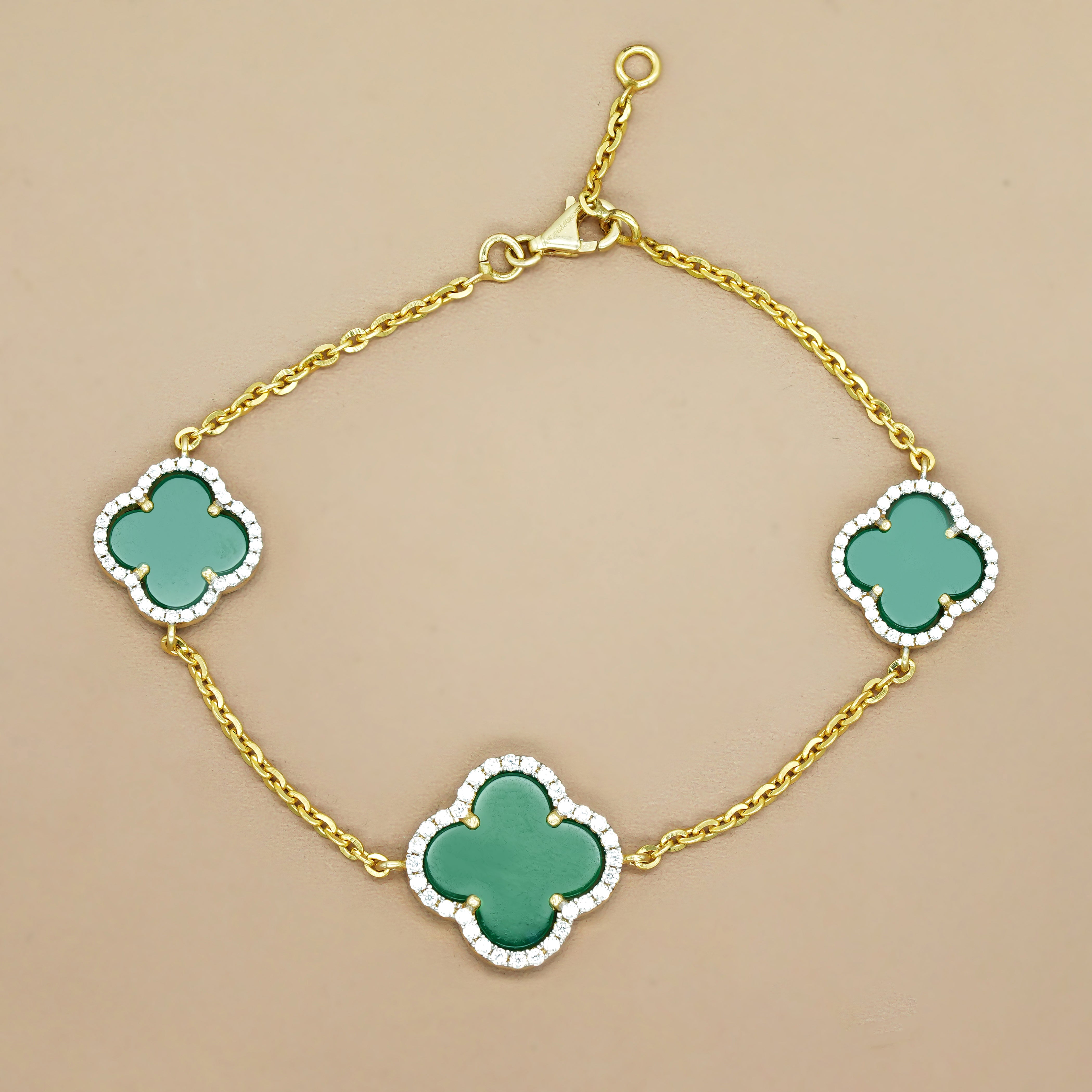 Add a touch of elegance to your collection with this exquisite gold bracelet. The design features four green enamel clover-shaped charms, each outlined with sparkling white stones, delicately spaced along a polished gold chain. The bracelet is secured with a clasp, ensuring both style and functionality. Its vibrant green and gold combination, complemented by the subtle shimmer of the white stones, makes it a perfect choice for any occasion.