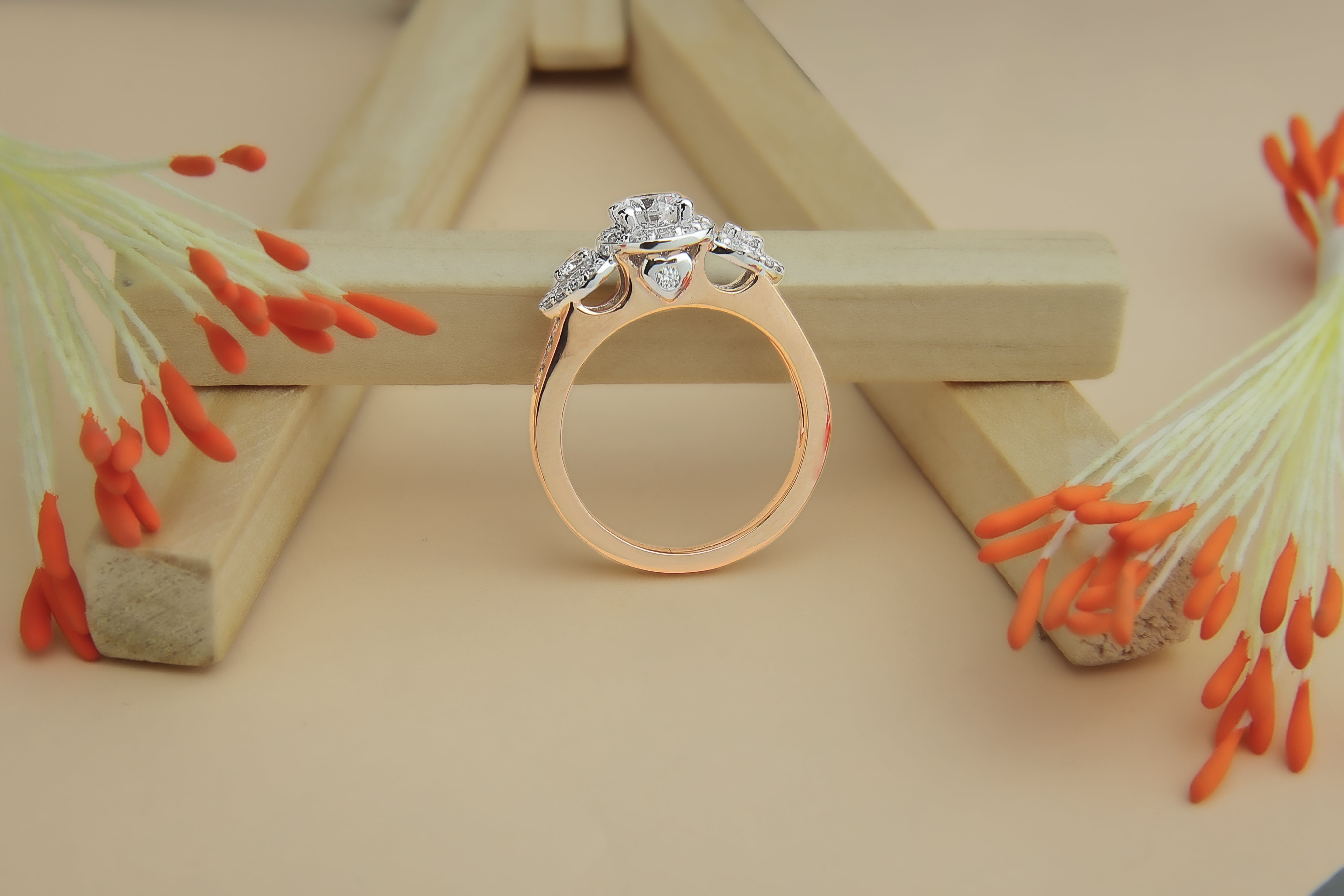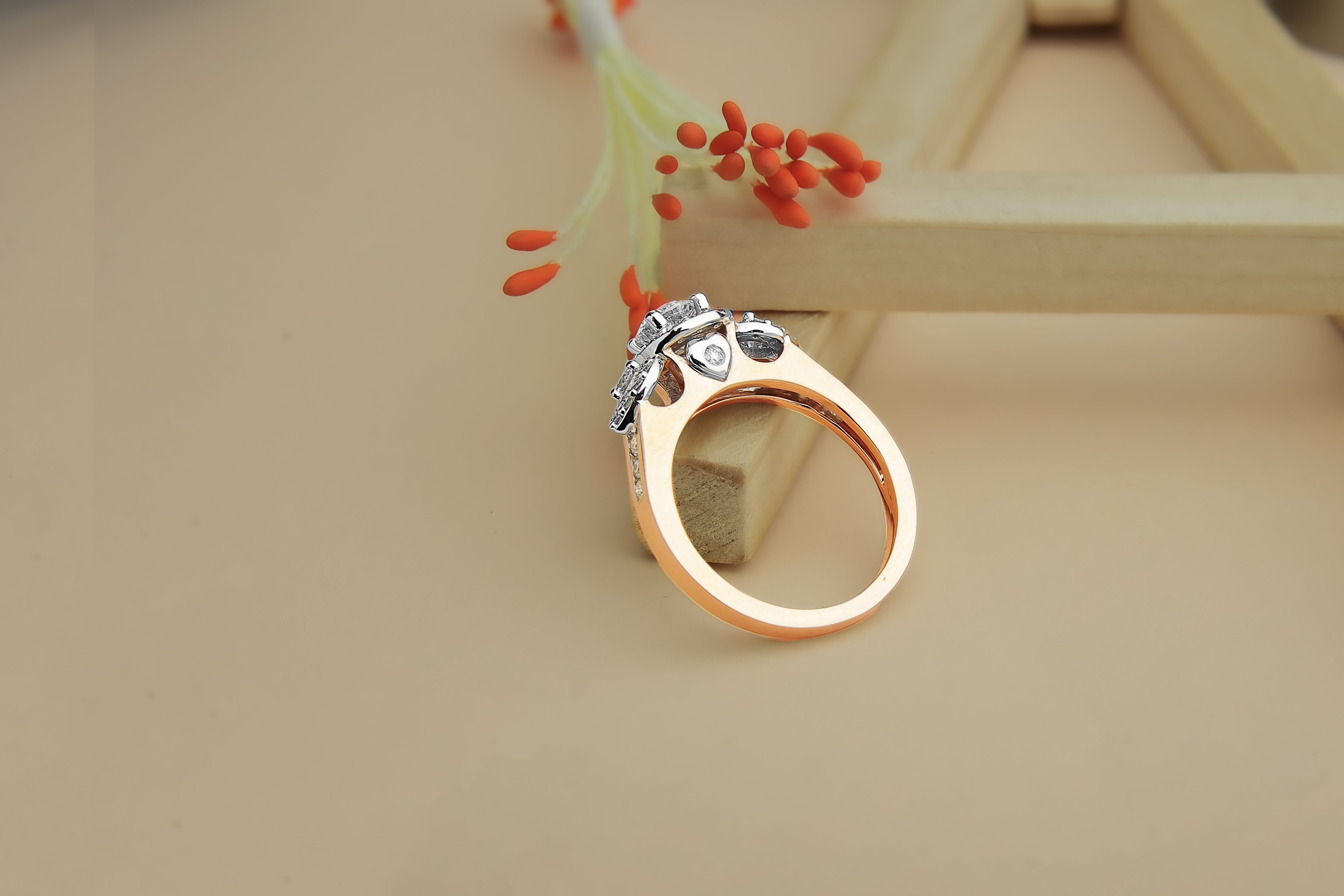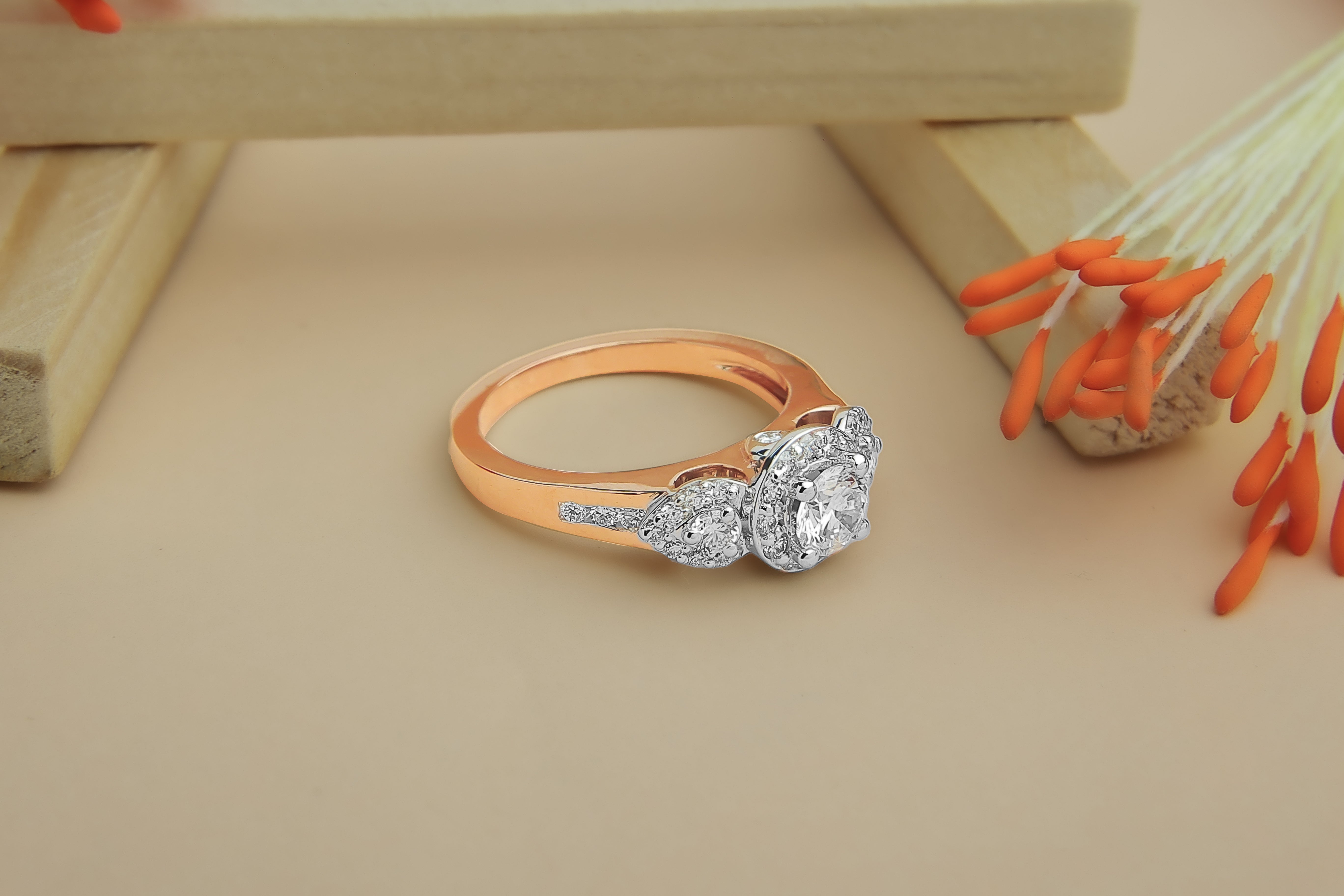 This exquisite three-stone ring features a brilliant diamond center stone framed by two dazzling side diamonds, all set on a warm rose gold band. The halo setting adds extra sparkle to each stone, enhancing their brilliance and creating a luxurious look. With a timeless design that symbolizes the past, present, and future, this ring is perfect for celebrating your most cherished moments. Its elegant blend of rose gold and diamonds makes it a stunning choice for any occasion, adding a touch of sophistication and romance to your style.